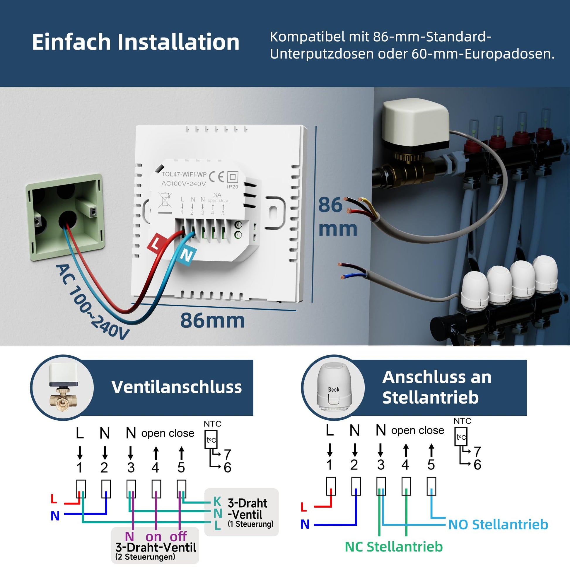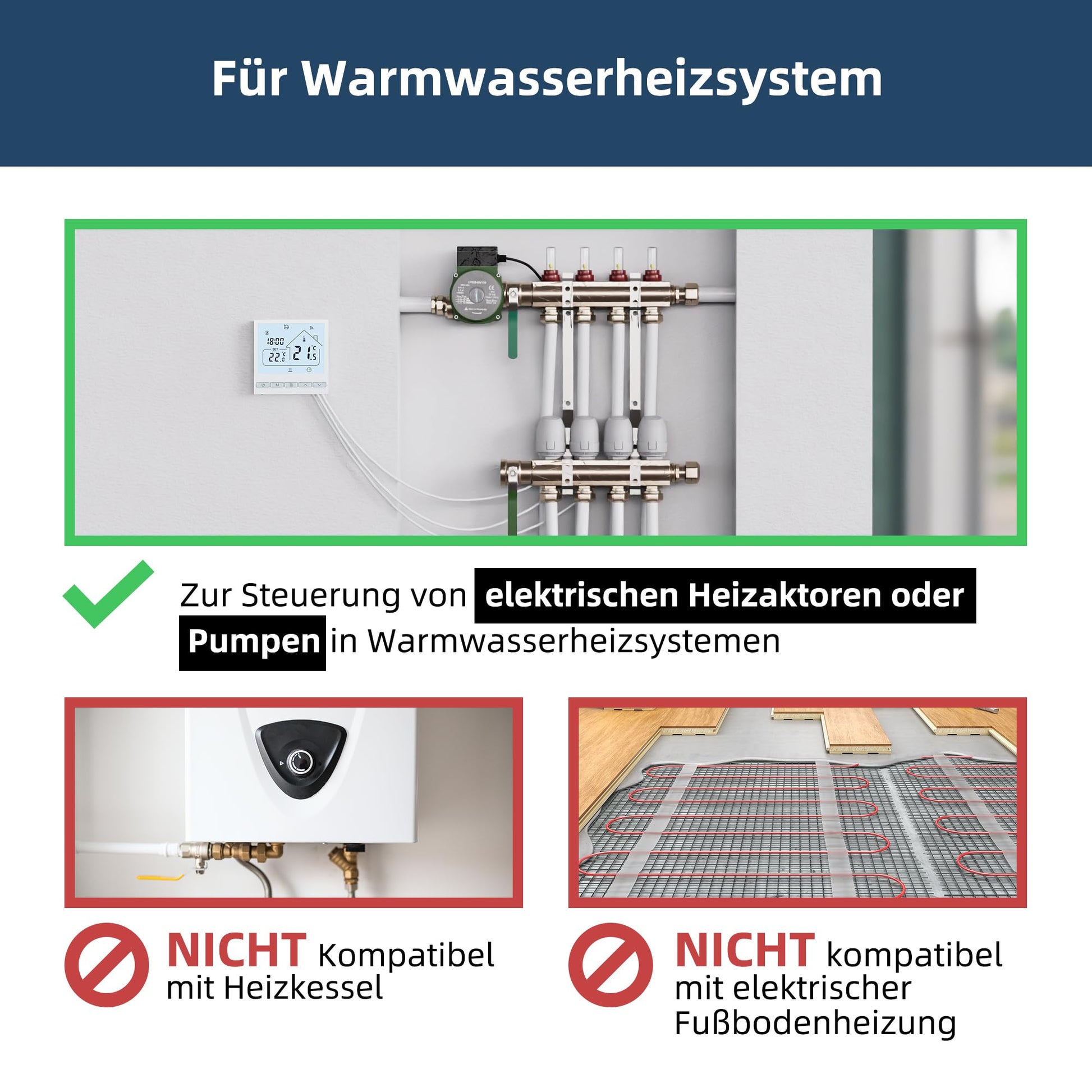 Dieses Set ist speziell für wasserbasierte Fussbodenheizungssysteme mit einer maximalen Last von 3A konzipiert. Es ist nicht für elektrische Fussbodenheizungen (typischerweise 16A) geeignet. Bitte überprüfen Sie vor dem Kauf die Spezifikationen Ihres Heizsystems.