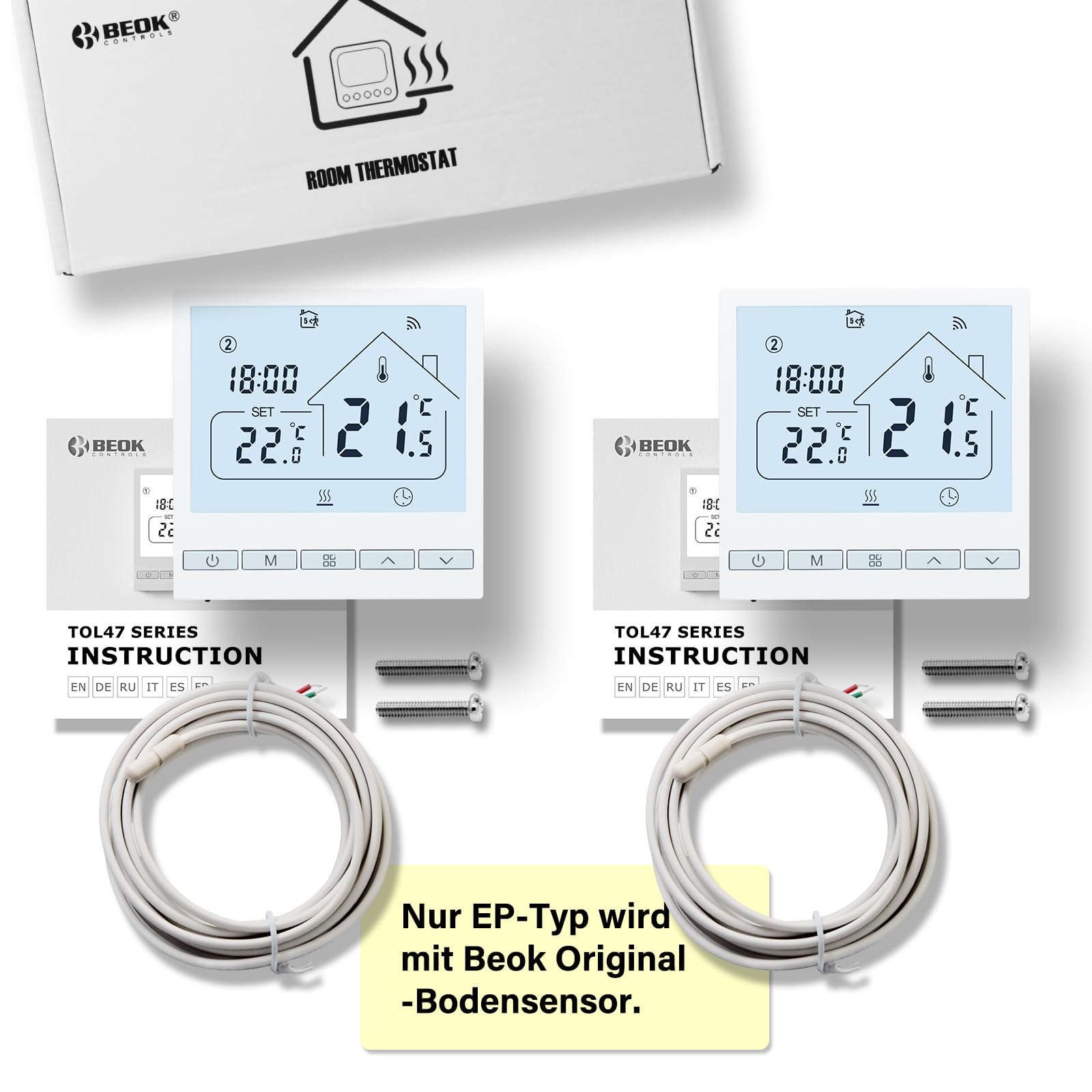 - Lieferumfang: 2x WLAN-Thermostat, 4x Befestigungsschrauben, 2x Bedienungsanleitung