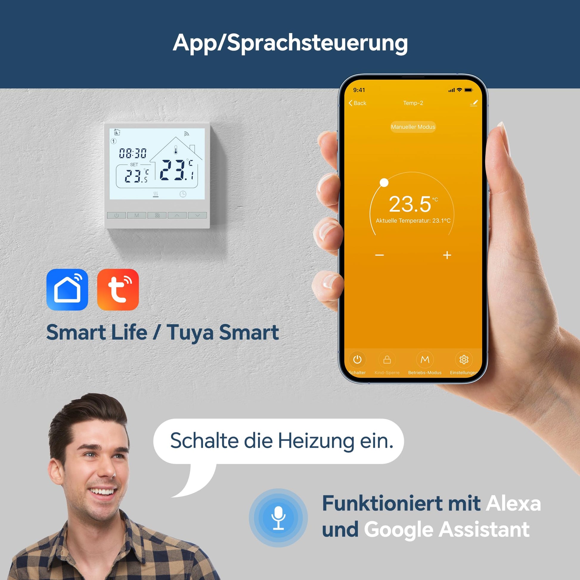 - Fernsteuerung per App: Vollständiger Zugriff auf die Heizungssteuerung über die Apps "TUYA" oder "Smart Life" (2.4 GHz WLAN erforderlich).