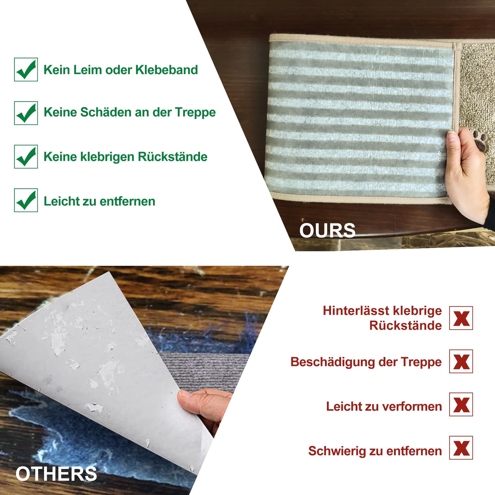 - Rückstandsfreie Befestigung: Die Matten kommen gänzlich ohne Klebstoff oder Klebeband aus. Sie lassen sich einfach anbringen, entfernen und wiederverwenden, ohne Spuren oder Schäden auf Ihren Treppen zu hinterlassen.