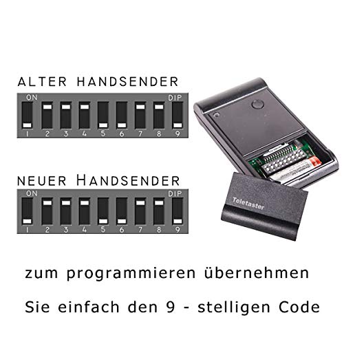 Die Programmierung erfolgt ganz einfach über die 9 DIP-Schalter (Mäuseklavier) im Inneren. Öffnen Sie das Gehäuse Ihres alten und neuen Senders und stellen Sie die Schalter im neuen Gerät exakt in dieselbe Position (ON/OFF) wie bei Ihrem bisherigen funktionierenden Handsender.