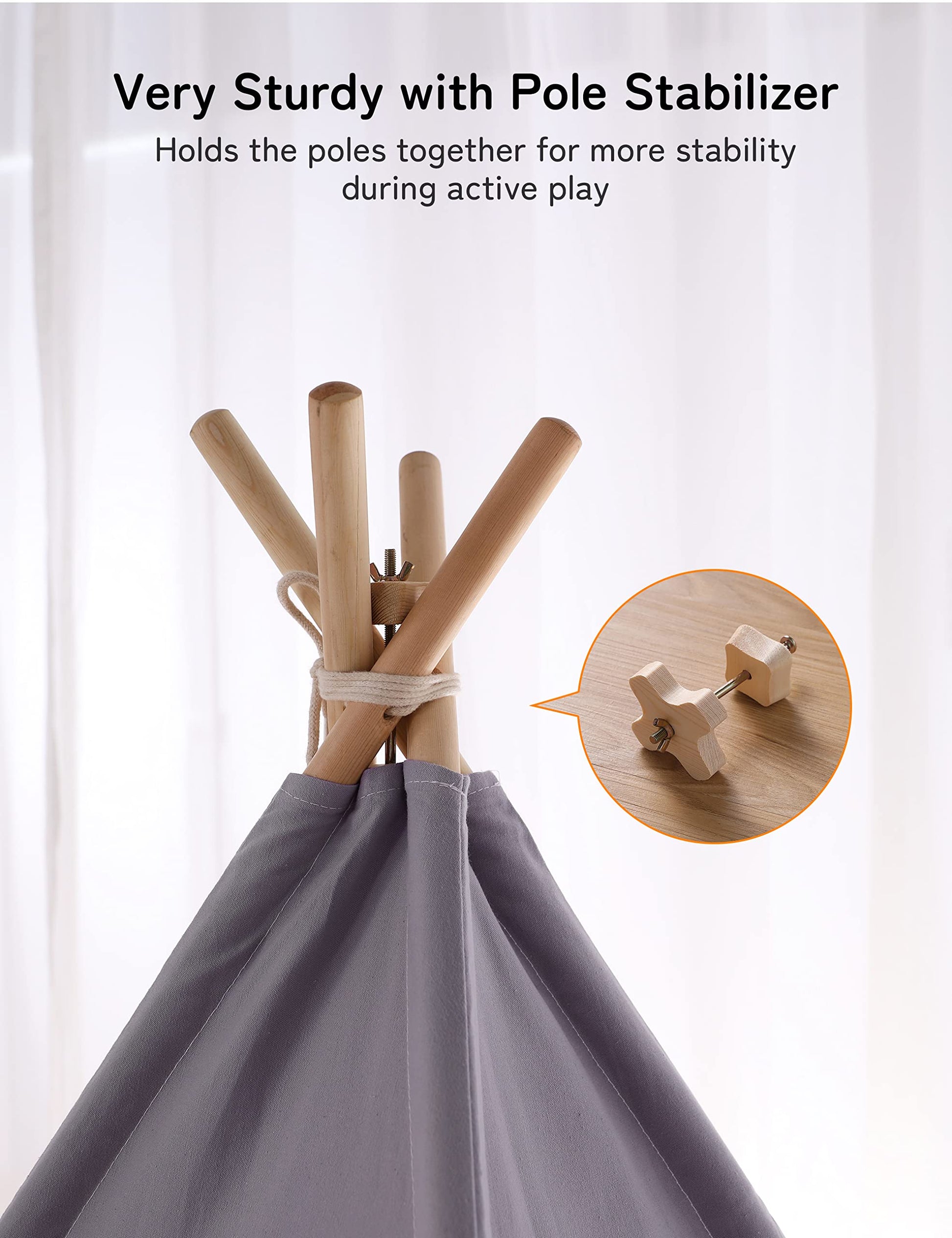 Das Zelt ist aus 100 % natürlicher Baumwolle und robusten Kiefernholzstangen gefertigt. Alle Materialien sind kindersicher, und ein spezieller Stabilisator sorgt für einen festen Stand und verhindert das Umkippen, was eine sichere Spielumgebung gewährleistet.