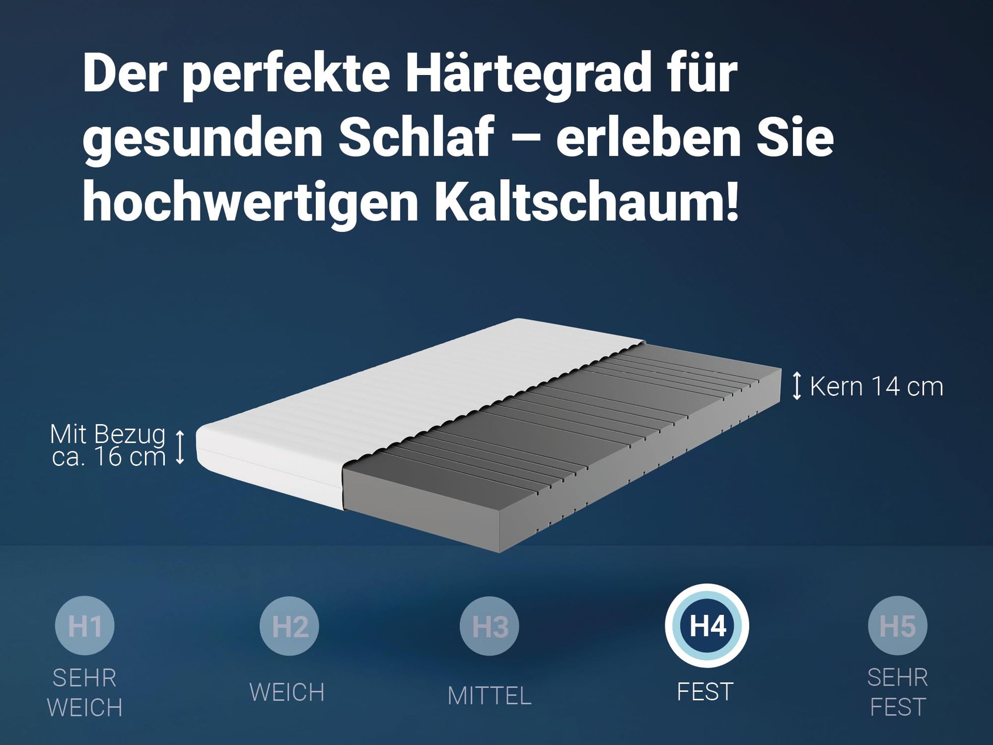 Der Härtegrad H4 ist als 'fest' eingestuft und eignet sich ideal für Personen mit einem Körpergewicht ab 100 kg. Er bietet die nötige Stabilität und Unterstützung, um ein zu tiefes Einsinken zu verhindern und die Wirbelsäule korrekt auszurichten.