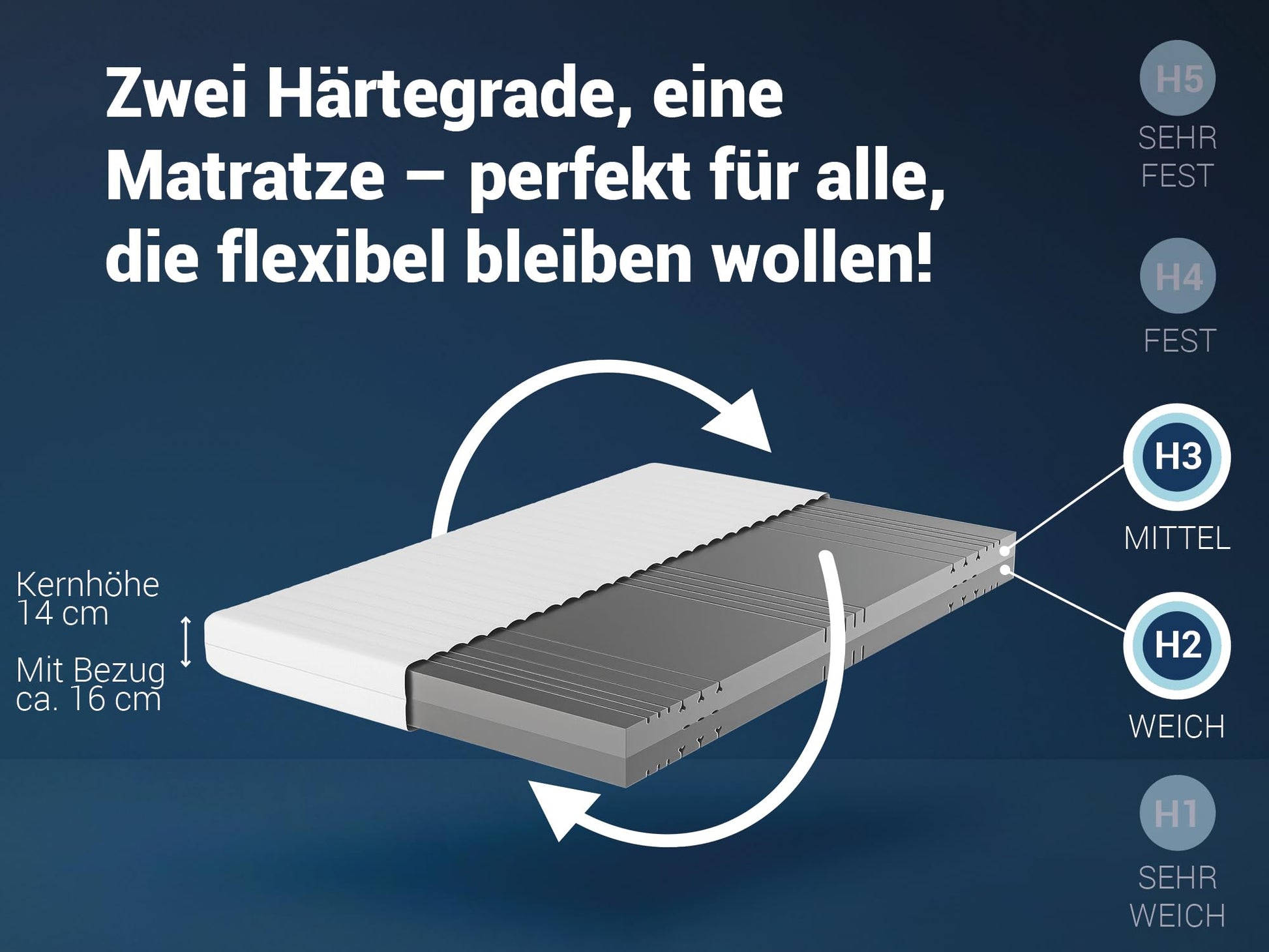 - Individuelle Härtegrade: Wendbare Matratze mit einer weichen (H2) und einer mittelfesten (H3) Liegeseite zur persönlichen Anpassung.