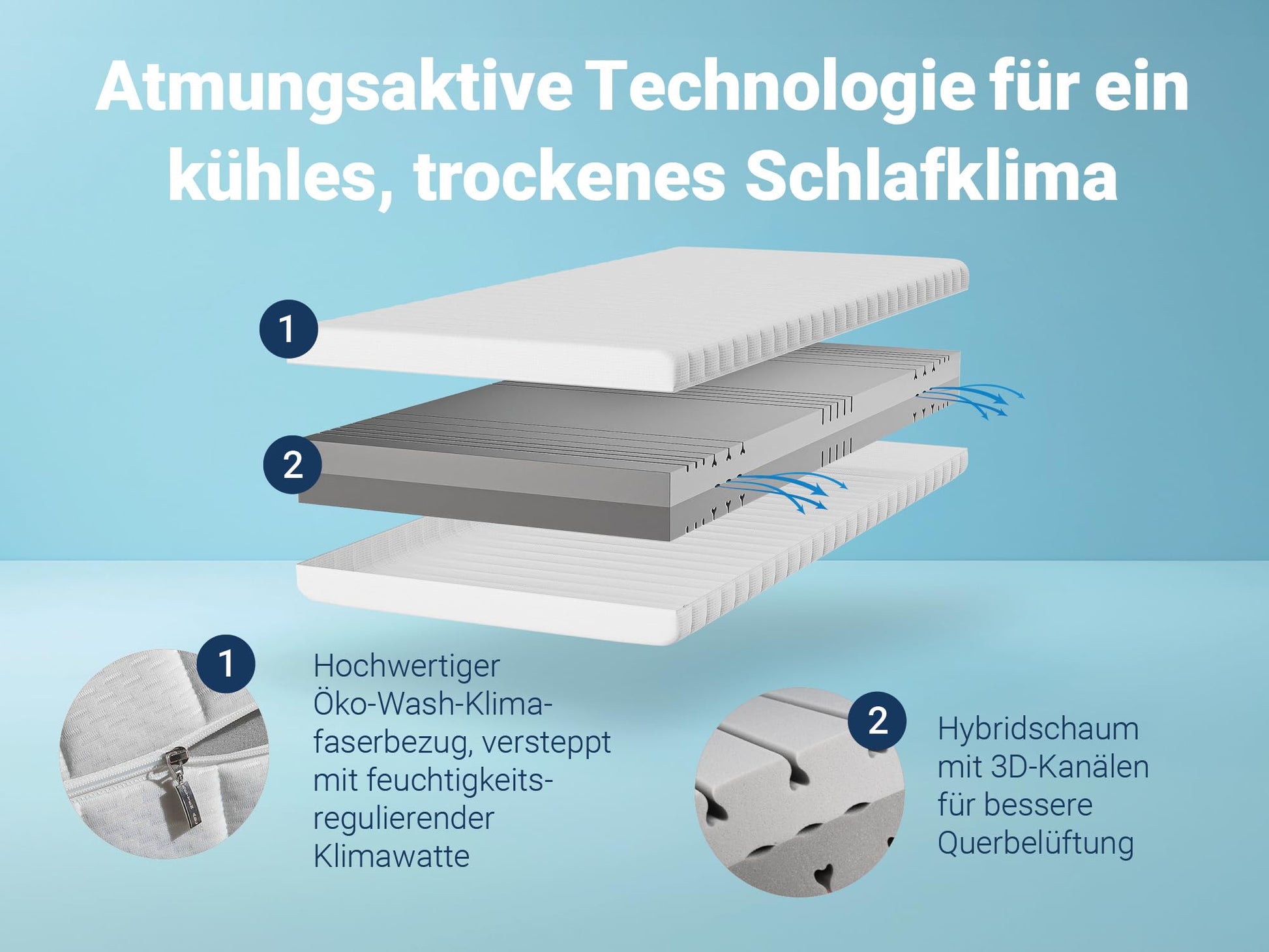 Der Kern der Matratze besteht aus einem innovativen Hybridschaum, der mit einer speziellen 3D-Schnitttechnik versehen ist. Diese offene Struktur fördert aktiv die Luftzirkulation und den Feuchtigkeitstransport, was Überhitzung verhindert und für ein konstant trockenes und ausgeglichenes Schlafklima sorgt.