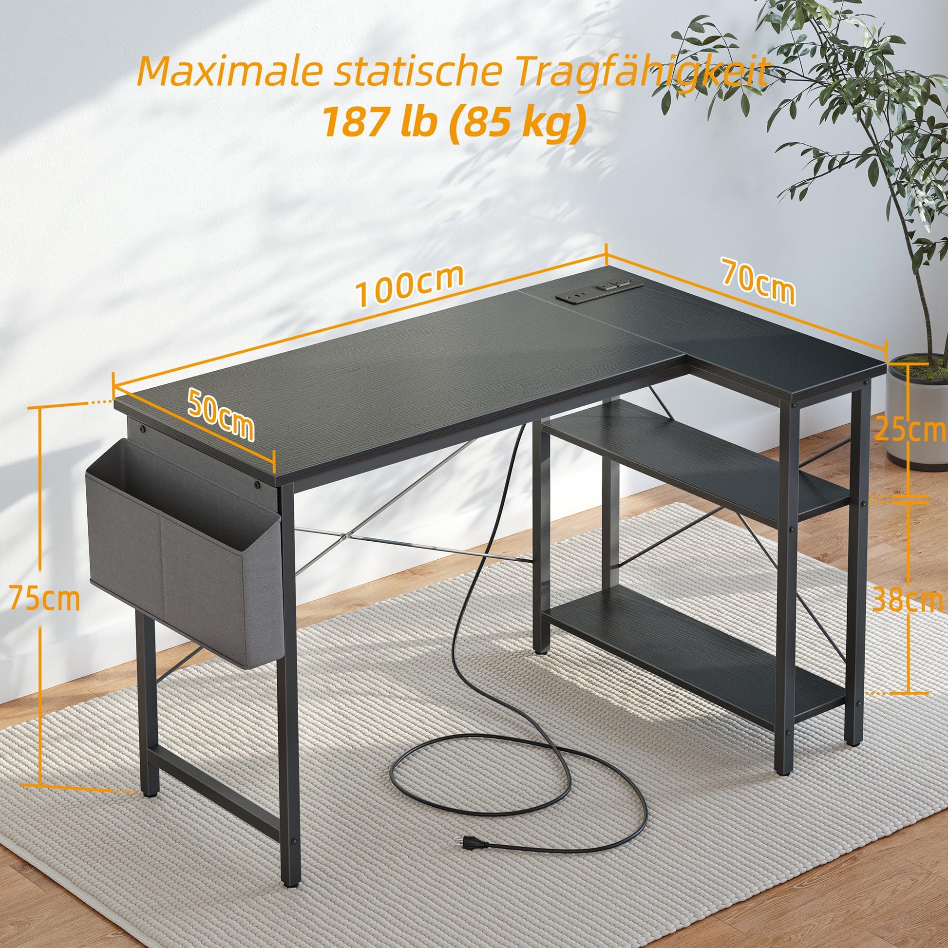 BEXEVUE Eckschreibtisch 100x70 cm Schwarz – Steckdosen, Reversibel