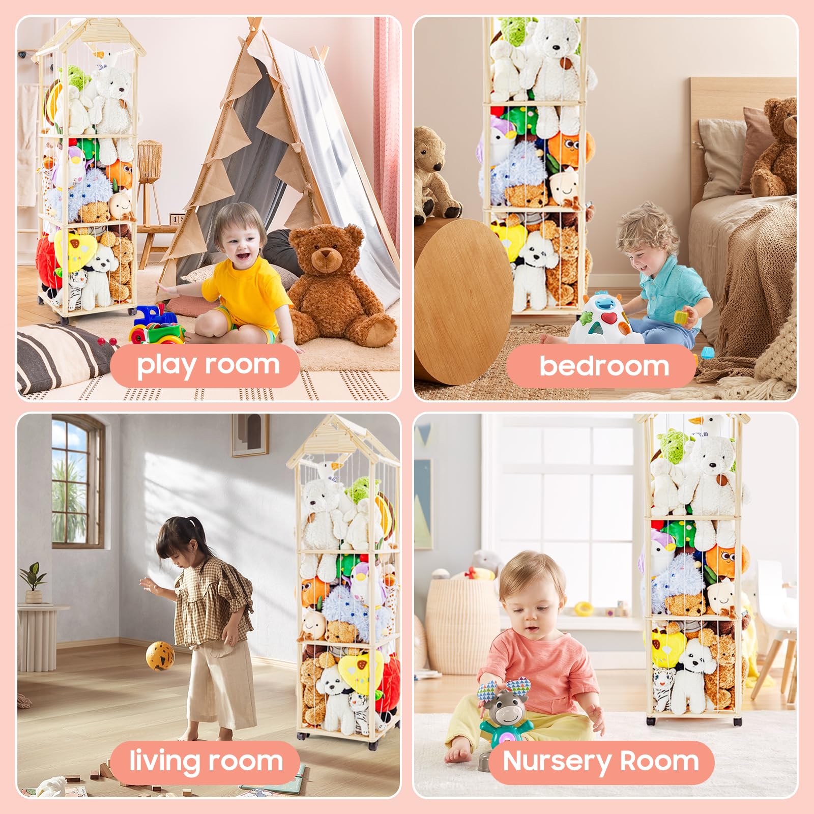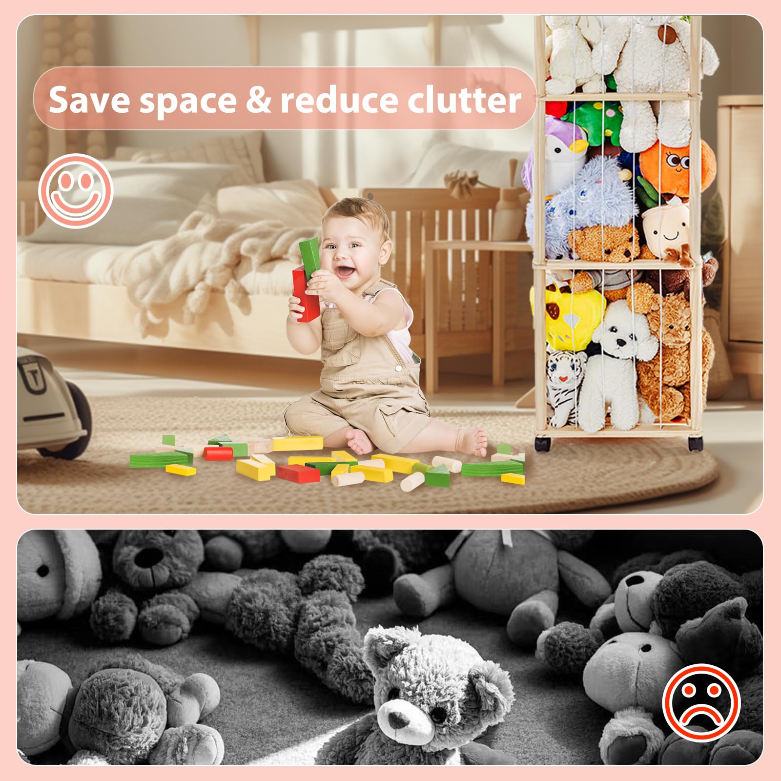 Dieses mobile Aufbewahrungsregal bringt Ordnung ins Plüschtier-Chaos und fügt sich mit seinem natürlichen Holzdesign harmonisch in jedes Kinderzimmer, Spielzimmer oder Wohnzimmer ein.