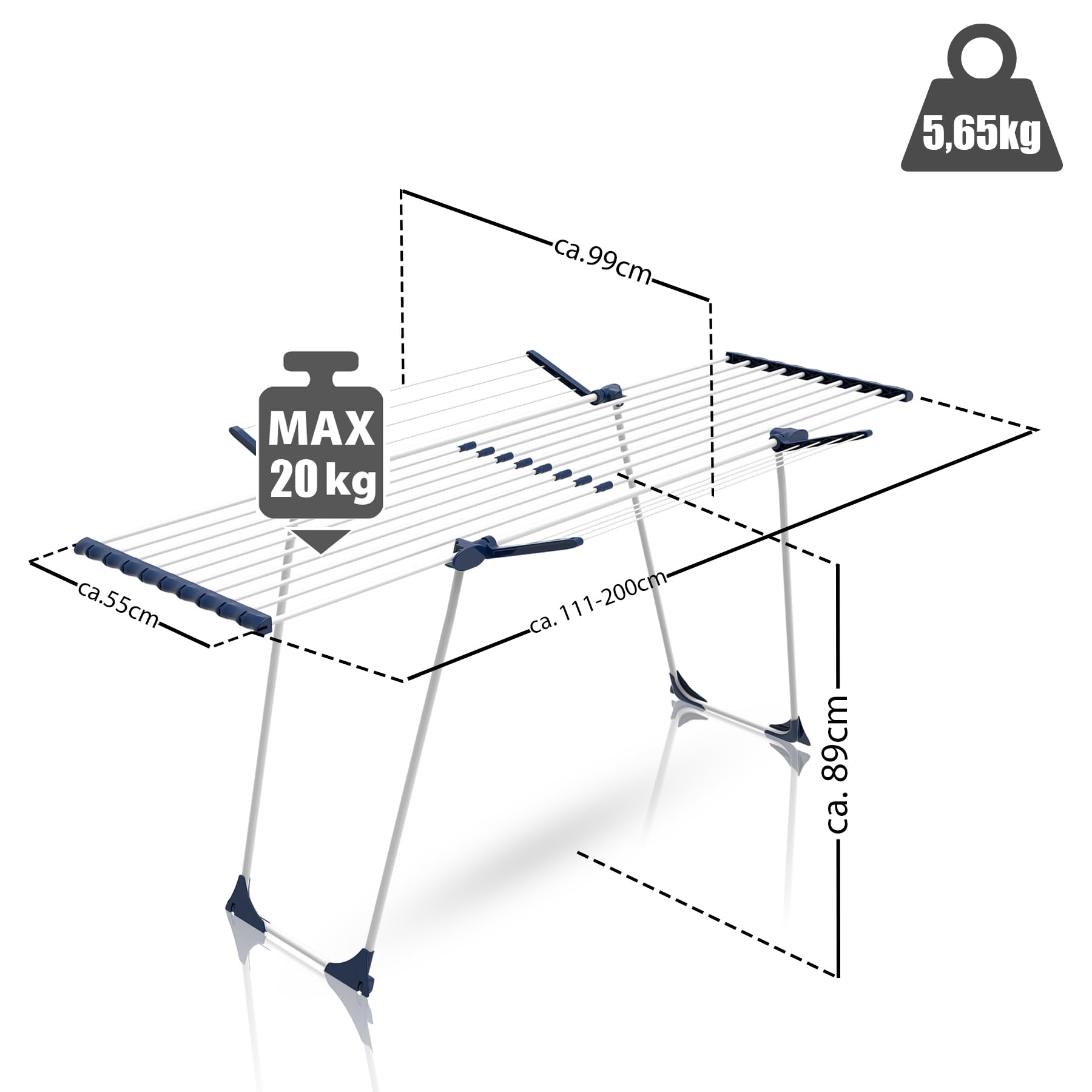 In vollständig ausgezogenem Zustand hat der Wäscheständer eine maximale Länge von ca. 200 cm und eine Höhe von ca. 89 cm. Detaillierte Massangaben finden Sie auf dem dritten Produktbild.