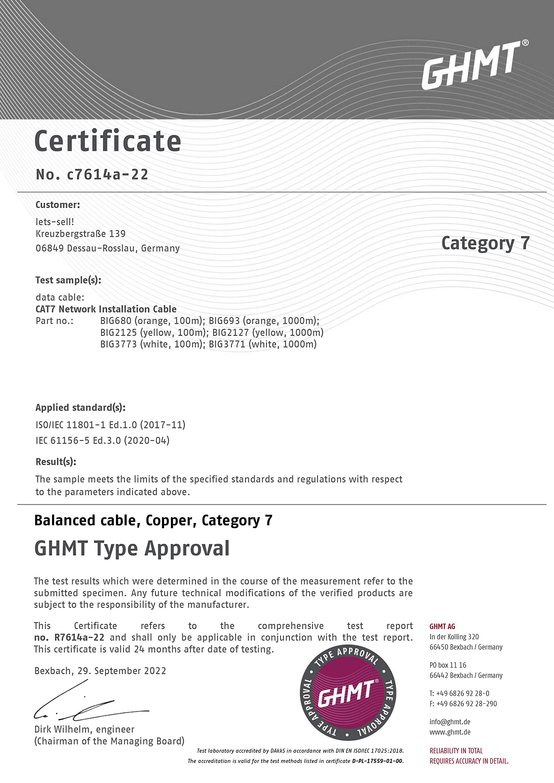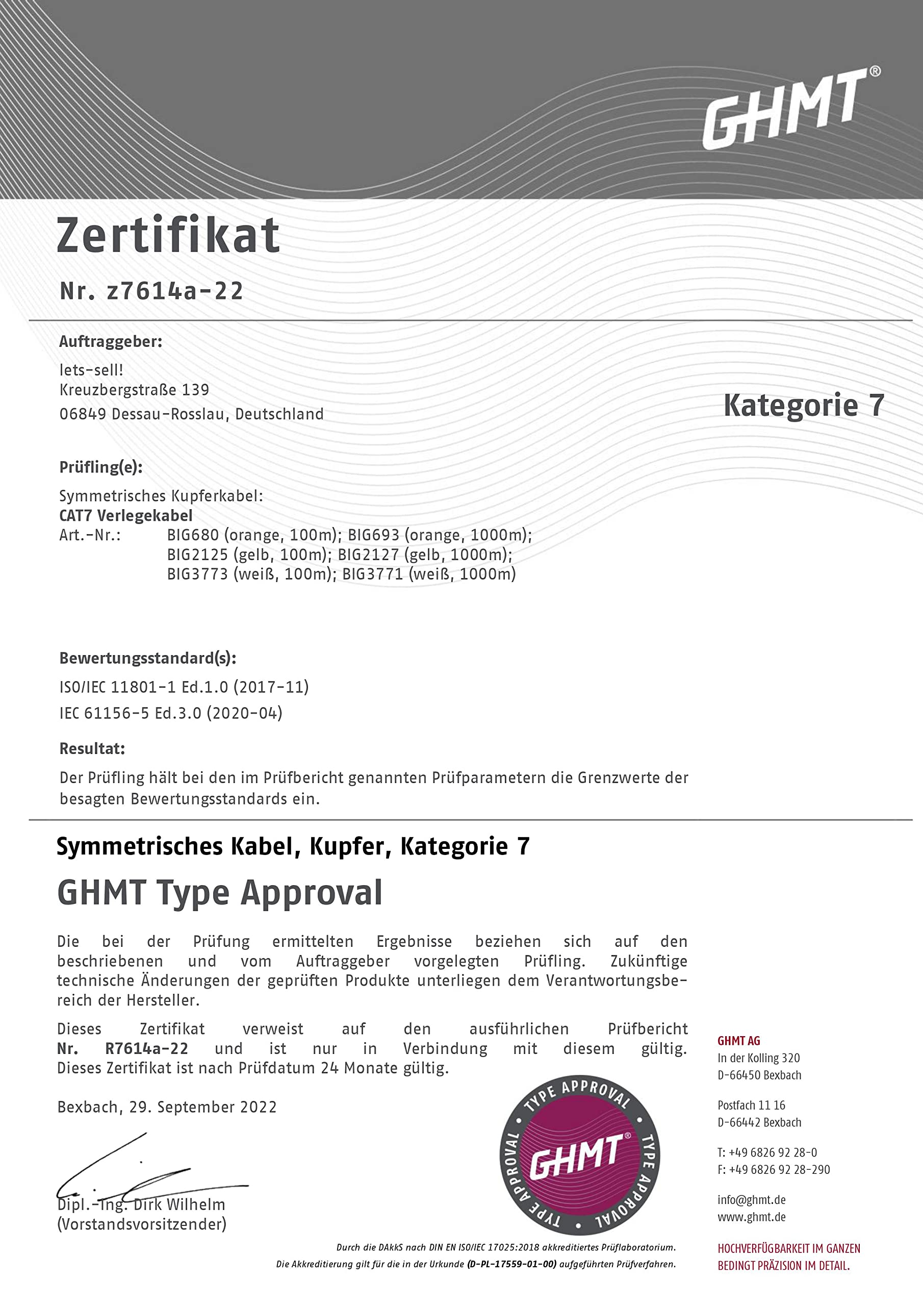 - Erfüllte Normen: ISO/IEC 11801-1, ISO/IEC 61156-5, IEC 60332-1, IEC 60754-2, IEC 61034