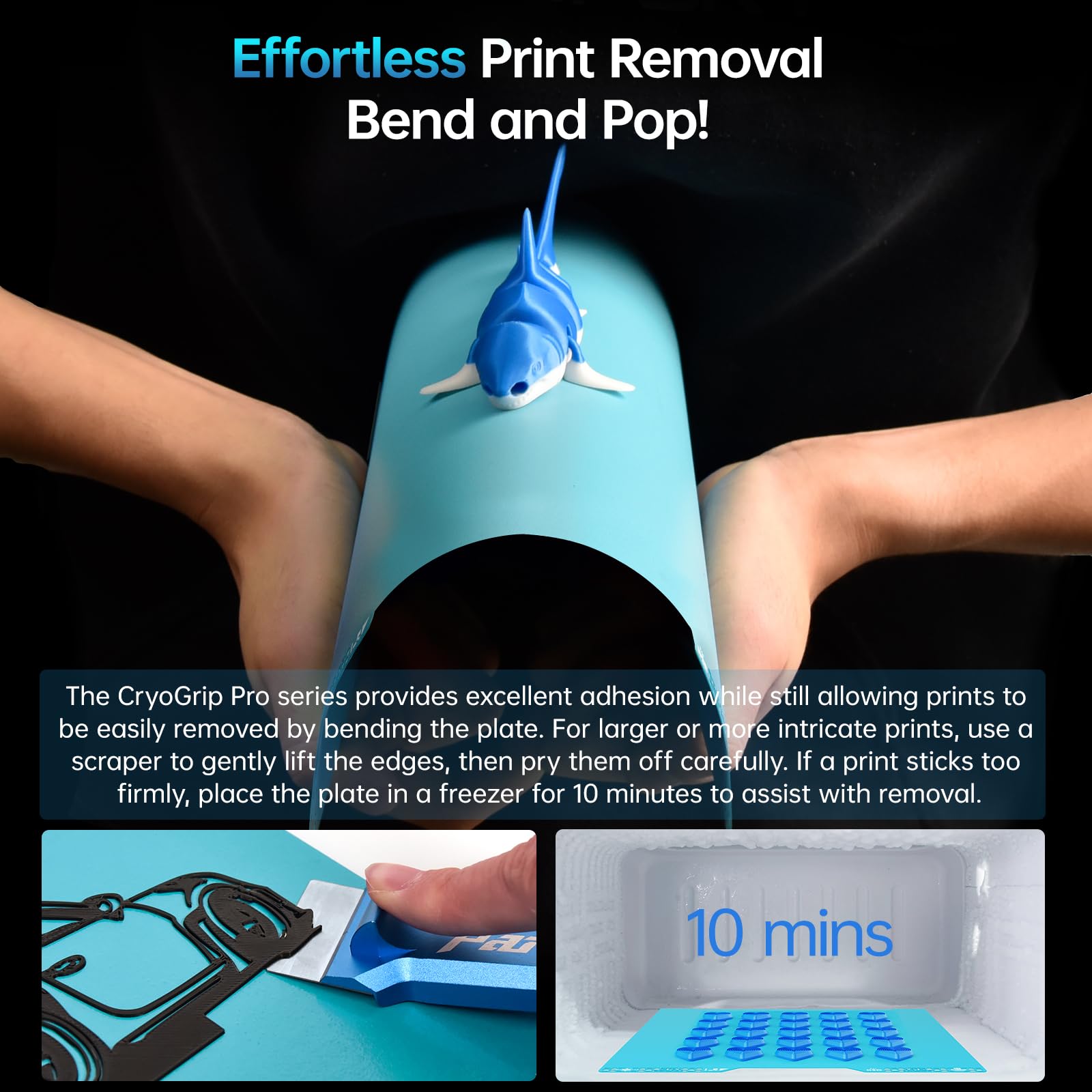 Die fertigen Modelle lassen sich mühelos und ohne Werkzeug entfernen, indem die flexible Stahlplatte leicht gebogen wird. Sie kehrt danach sofort wieder in ihren flachen Zustand zurück. Zur Auffrischung der Haftwirkung genügt eine einfache Reinigung mit Wasser, Seife oder Alkohol.