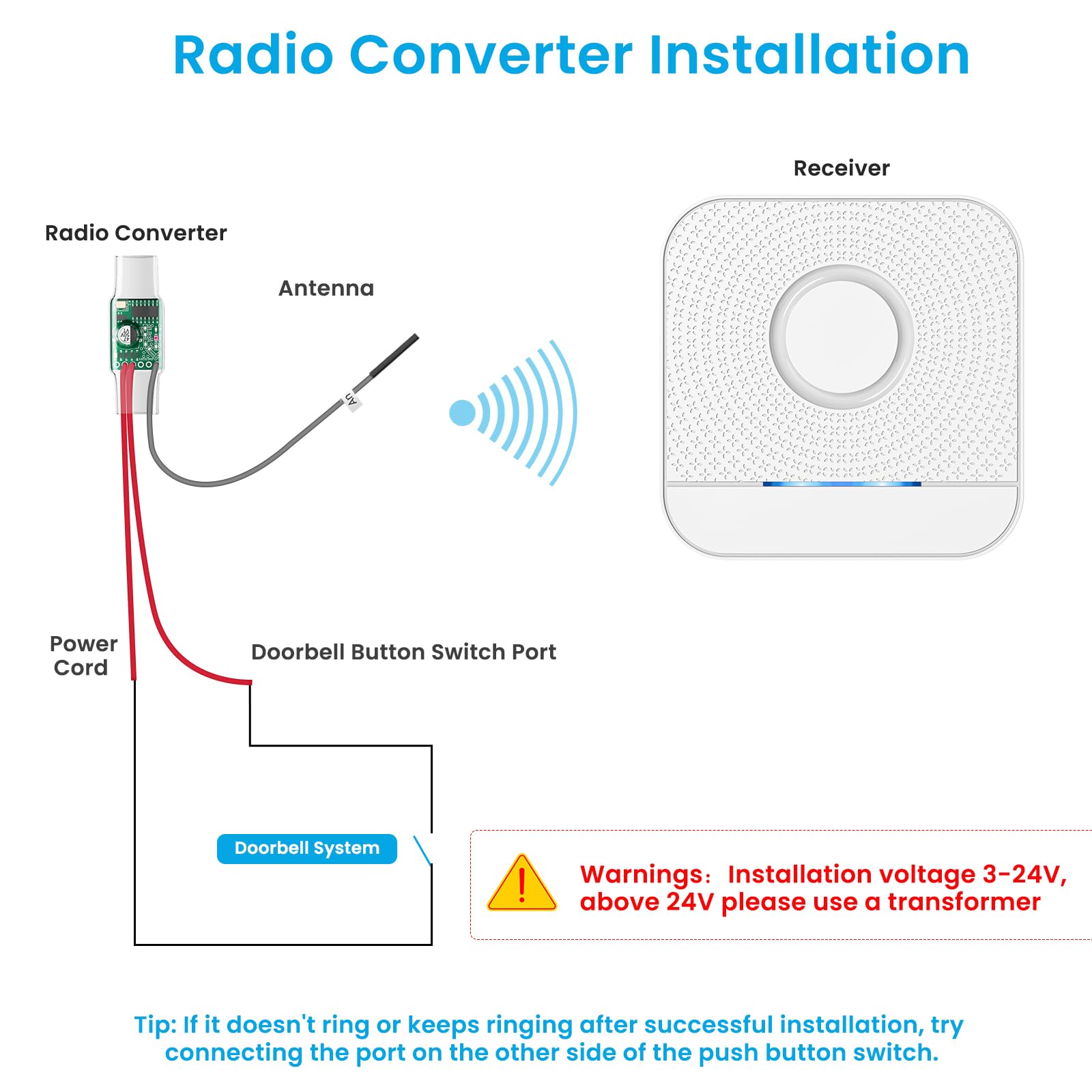 Die Installation ist sehr einfach. Der Sender wird an die Niederspannungskabel (3-24V AC/DC) Ihrer Klingel angeschlossen und benötigt dank Stromversorgung über den Klingeltrafo keine Batterien. Er ist universell mit fast allen elektronischen und mechanischen Klingeltypen kompatibel.