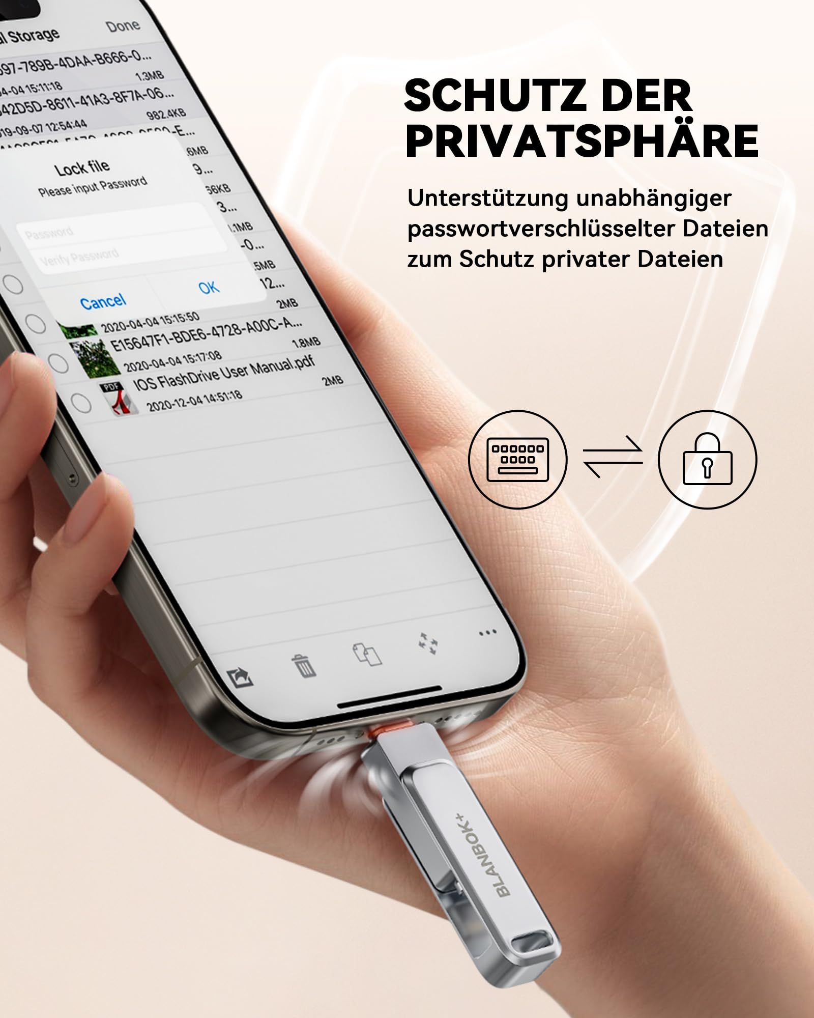 Für die Nutzung an einem iPhone oder iPad (iOS 12.1 oder neuer) installieren Sie bitte die kostenlose App "Luxsync Pro" aus dem App Store. Für Android-Geräte ist keine zusätzliche App erforderlich; aktivieren Sie einfach die OTG-Funktion in den Einstellungen Ihres Telefons, um den Stick zu verwenden.