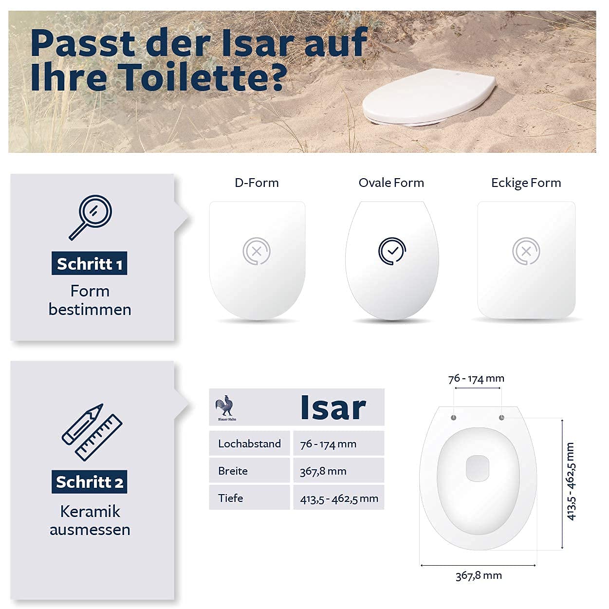 Der WC-Sitz Isar besitzt eine universelle O-Form (oval), die auf die meisten handelsüblichen Standard-WCs passt. Um eine perfekte Passform zu garantieren, empfehlen wir, die Masse Ihrer Keramik mit den technischen Daten des Sitzes abzugleichen, bevor Sie den Kauf tätigen.