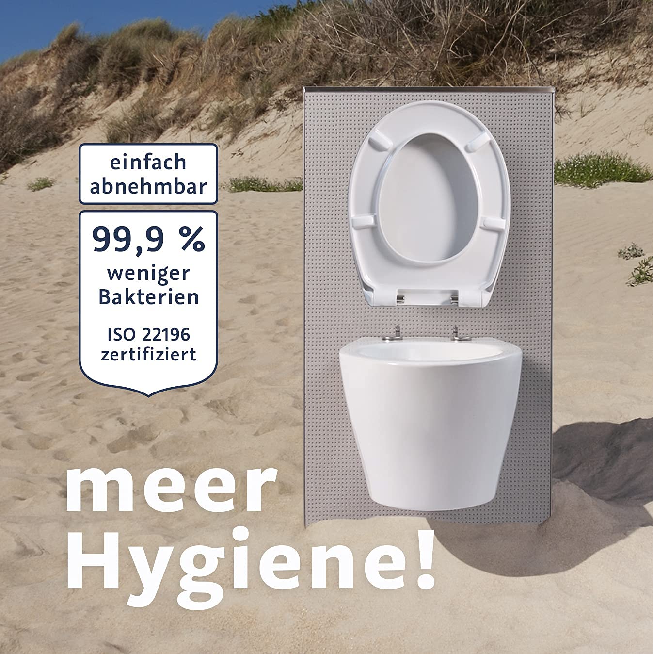 Zwei Hauptmerkmale sorgen für optimale Hygiene: Erstens lässt sich der gesamte Sitz dank der Quick-Release-Funktion per Knopfdruck abnehmen, was eine gründliche Reinigung auch an schwer zugänglichen Stellen ermöglicht. Zweitens besteht der Sitz aus Urea-Duroplast mit einer zertifizierten antibakteriellen Oberfläche, die die Ausbreitung von Keimen hemmt.