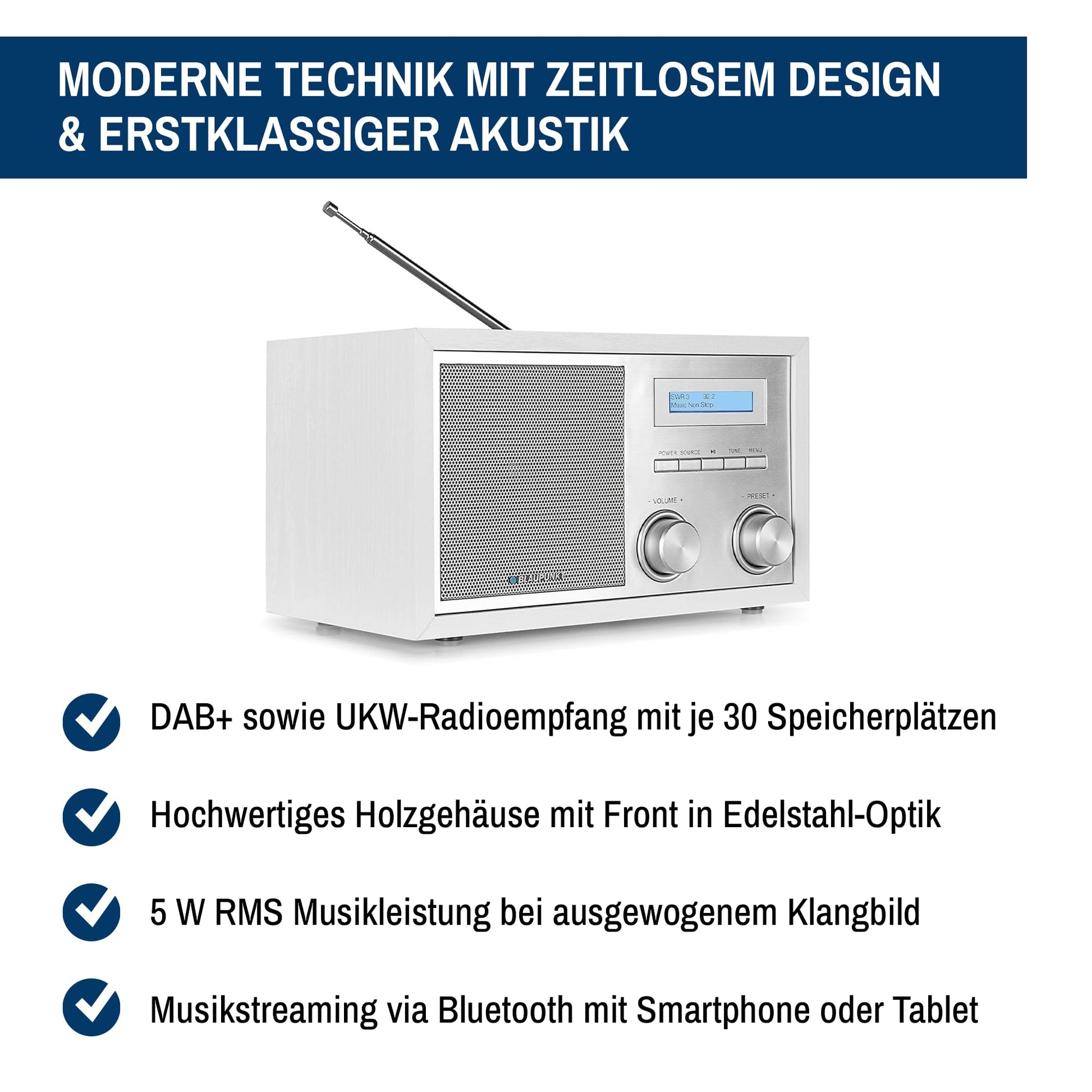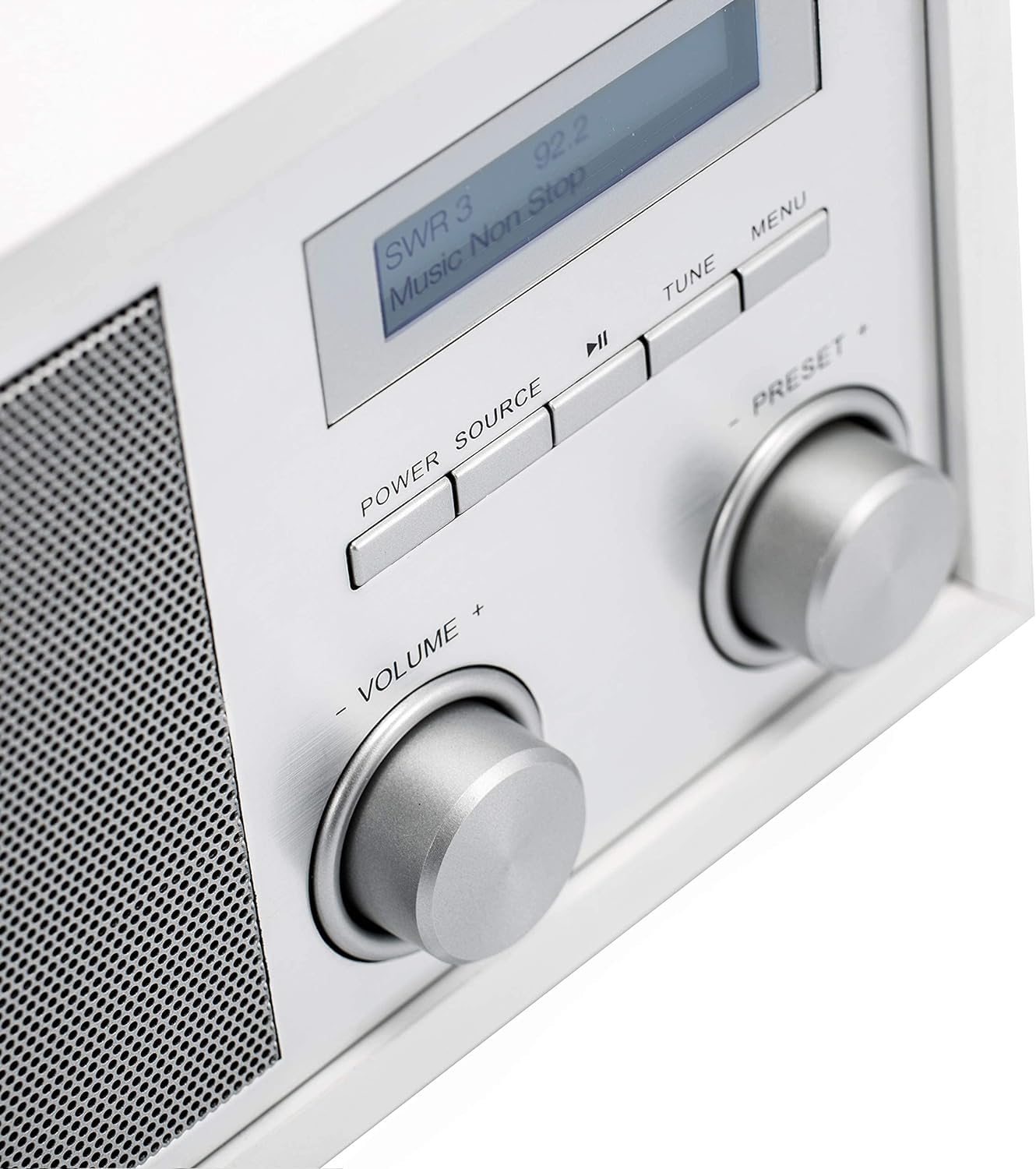 Das Herzstück dieses Radios ist seine klangliche und funktionale Vielseitigkeit. Der sorgfältig abgestimmte Holzkorpus liefert einen warmen und vollen Sound, der jeden Raum belebt. Dank modernstem DAB+ Empfang erleben Sie Ihre Lieblingssender in digitaler Qualität komplett ohne Rauschen. Gleichzeitig haben Sie mit Bluetooth und AUX-Eingang die Freiheit, Ihre persönlichen Playlists von jedem beliebigen Gerät abzuspielen.