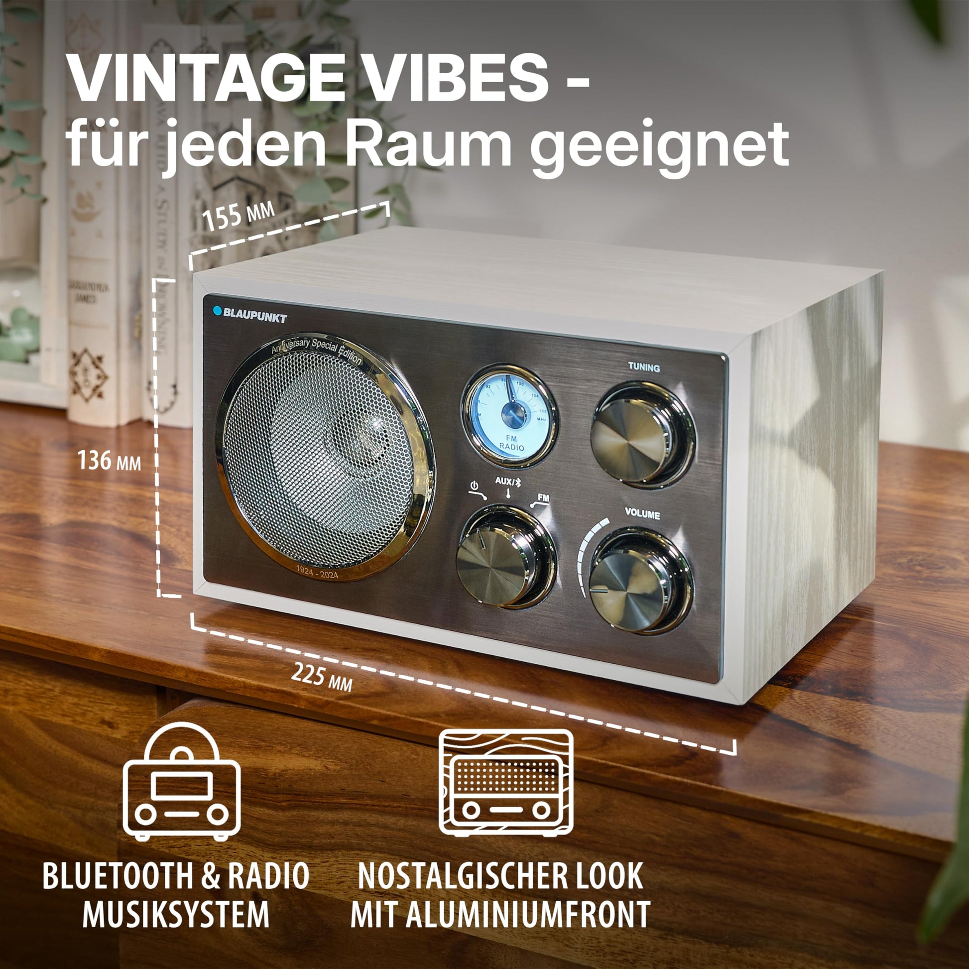 - Authentisches Design: Eine edle Aluminiumfront, drei hochwertige Drehregler und eine klassisch beleuchtete Frequenzskala unterstreichen den Retro-Look.