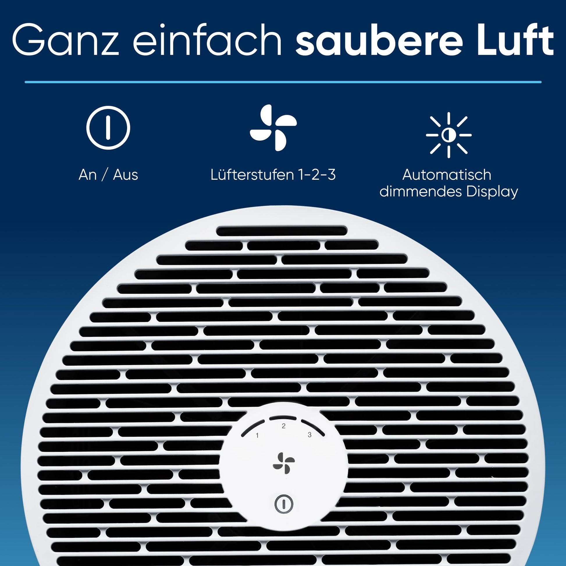 Das Gerät entfernt mindestens 99,97 % aller in der Luft befindlichen Partikel bis zu einer Grösse von 0,1 Mikrometern. Dazu gehören Staub, Pollen, Tierhaare und auch Rauchpartikel, um für eine umfassend saubere und frische Luft zu sorgen.