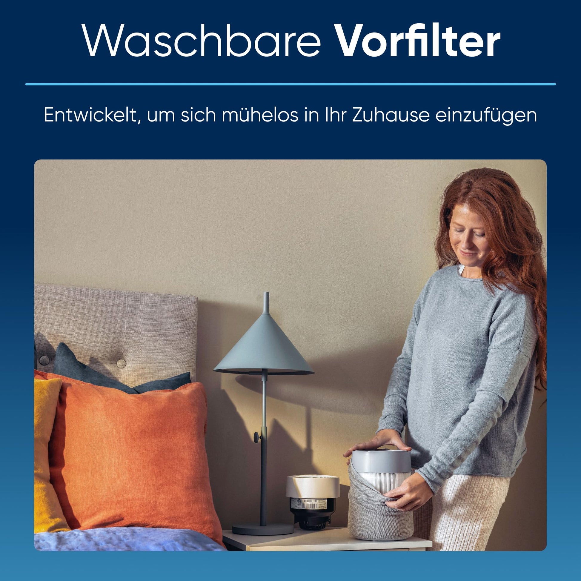 Für eine konstant hohe Leistung sollte der Hauptfilter alle 6 bis 9 Monate ausgetauscht werden. Der stilvolle Stoff-Vorfilter (Farbe: Stockholm Fog) ist abnehmbar und waschbar, was die Wartung erleichtert.