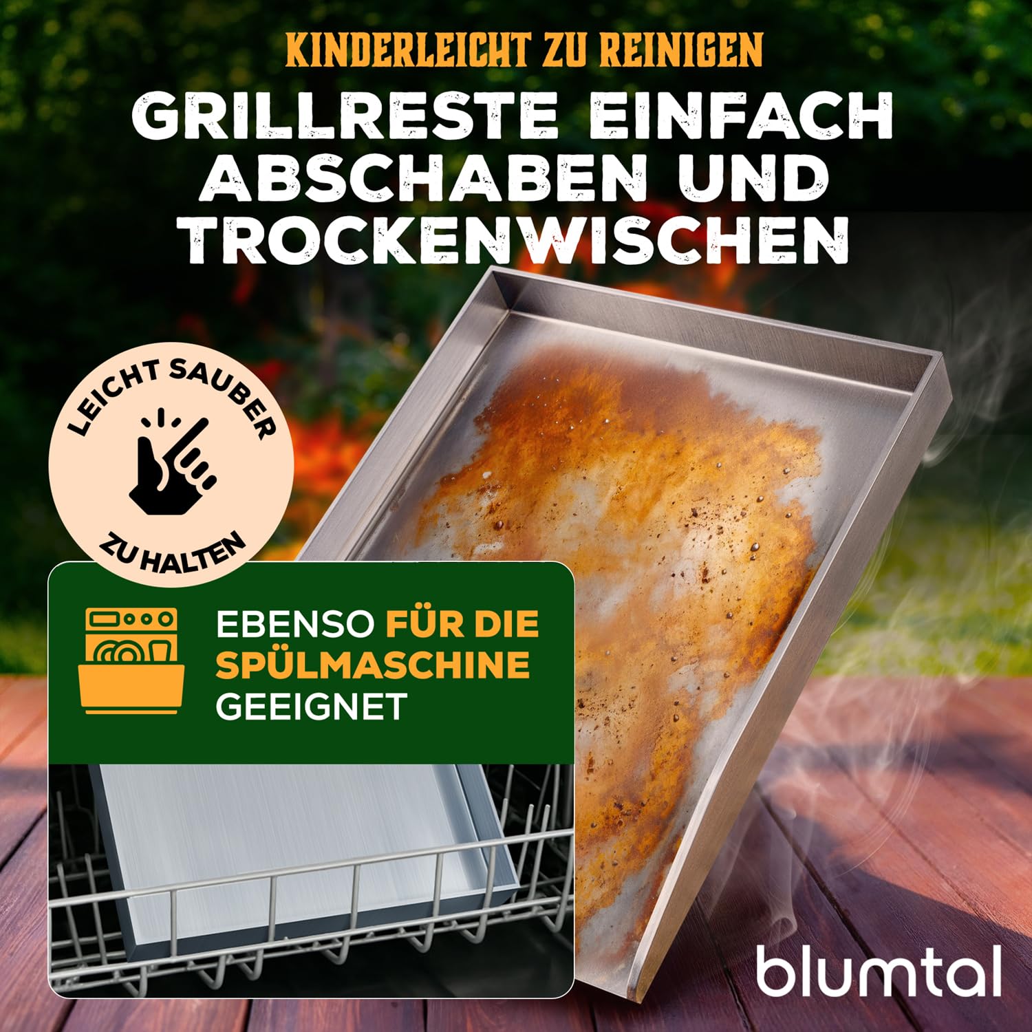 Wie reinige ich die Edelstahl-Plancha am besten und ist sie spülmaschinenfest?