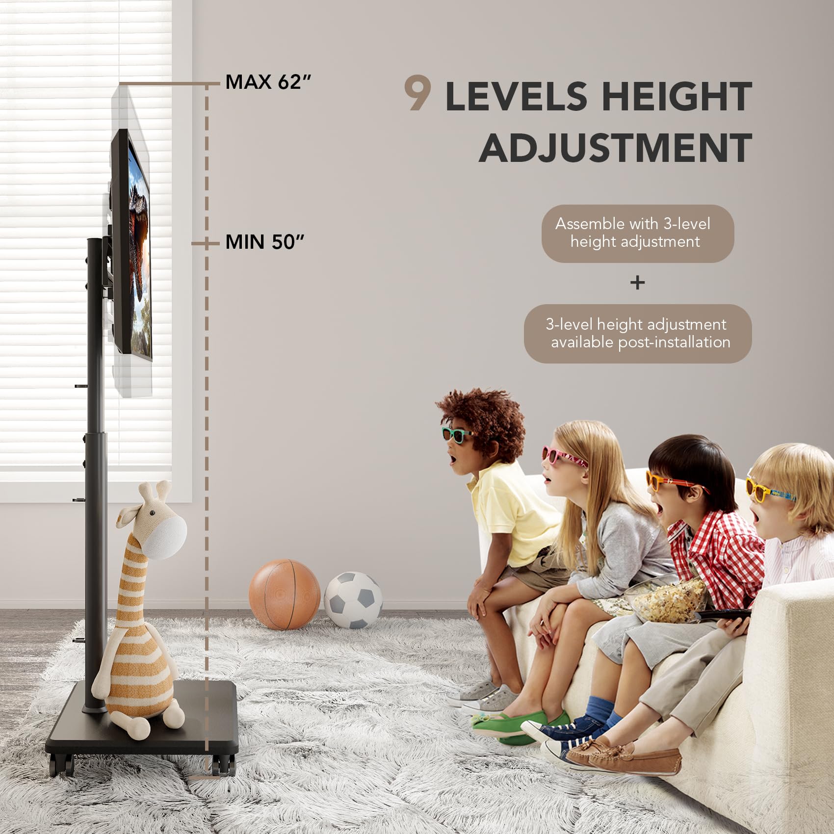 Dieser universelle TV-Ständer auf Rollen bietet eine mobile und flexible Lösung, um Ihren Bildschirm genau dort zu platzieren, wo Sie ihn benötigen. Er kombiniert eine robuste Bauweise mit durchdachten Funktionen für eine optimale Ausrichtung Ihres Fernsehers.