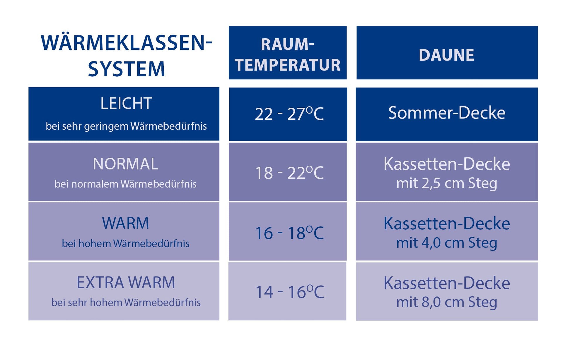 - Konstruktion: Kassettensteppung mit 2,5 cm hohen Innenstegen, die das Verrutschen der Füllung verhindern.