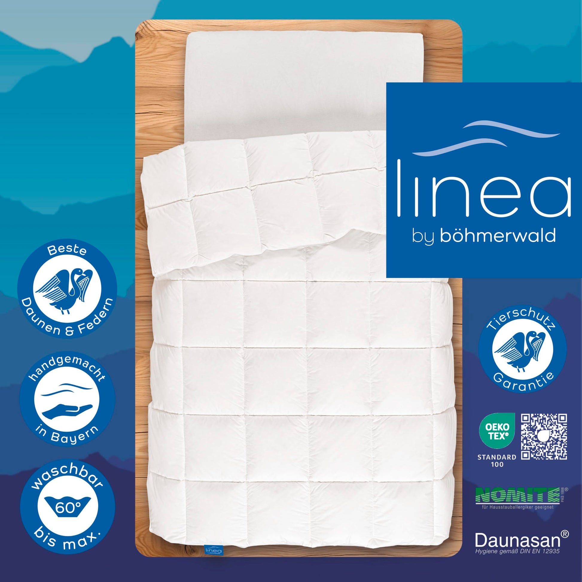 Verantwortungsvoll hergestellt: Die Marke Böhmerwald steht für Qualität "Made in Germany" und verpflichtet sich einem Null-Toleranz-Standard beim Tierschutz. Es wird garantiert, dass die verwendeten Daunen und Federn ausschliesslich nicht von lebenden Tieren stammen.