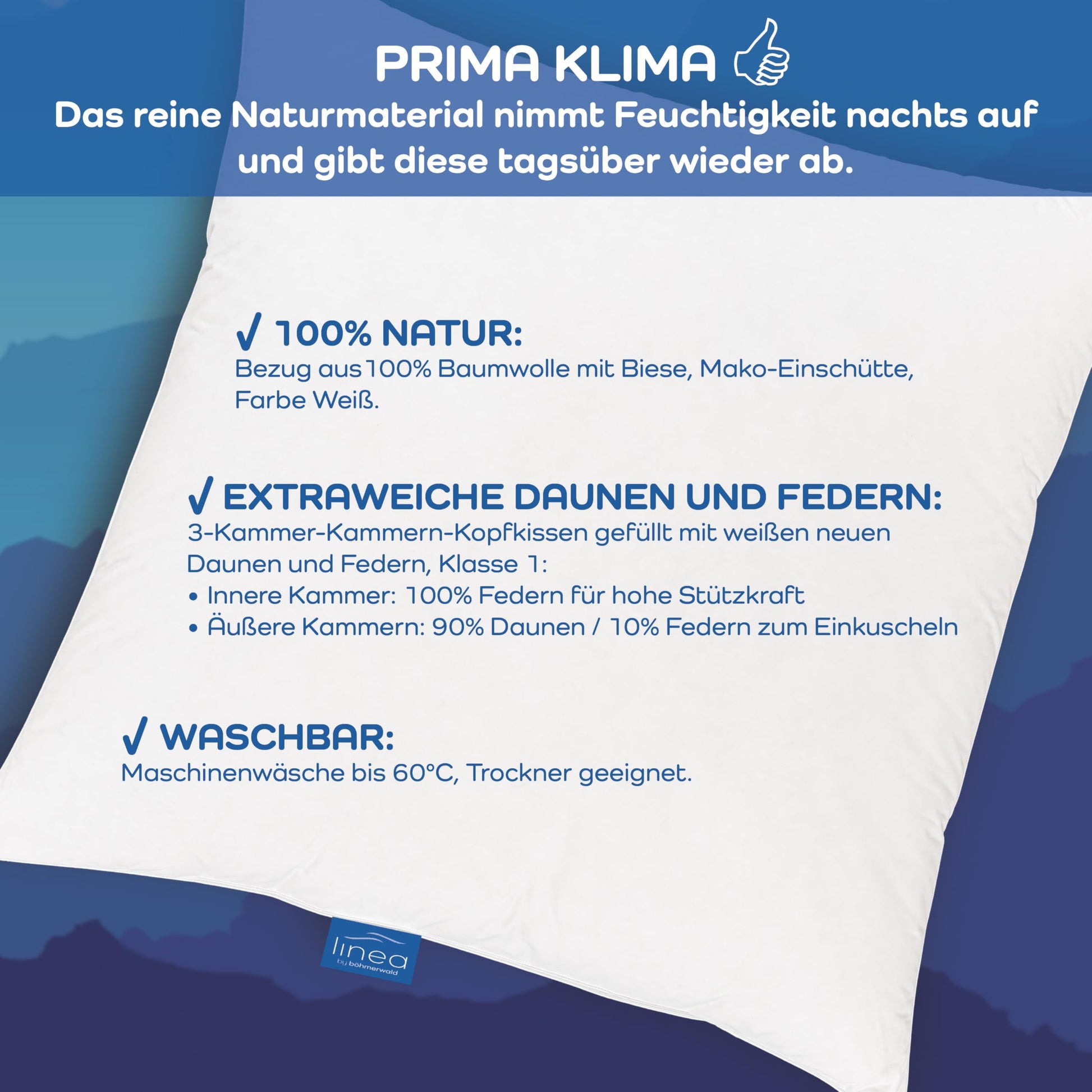 Es kombiniert einen stützenden Kern aus 100% Federn für den Nacken mit zwei weichen Aussenkammern aus 90% Daunen für ein wolkenweiches Liegegefühl. So erhalten Sie die ideale Balance aus fester Stützkraft und kuscheligem Komfort.