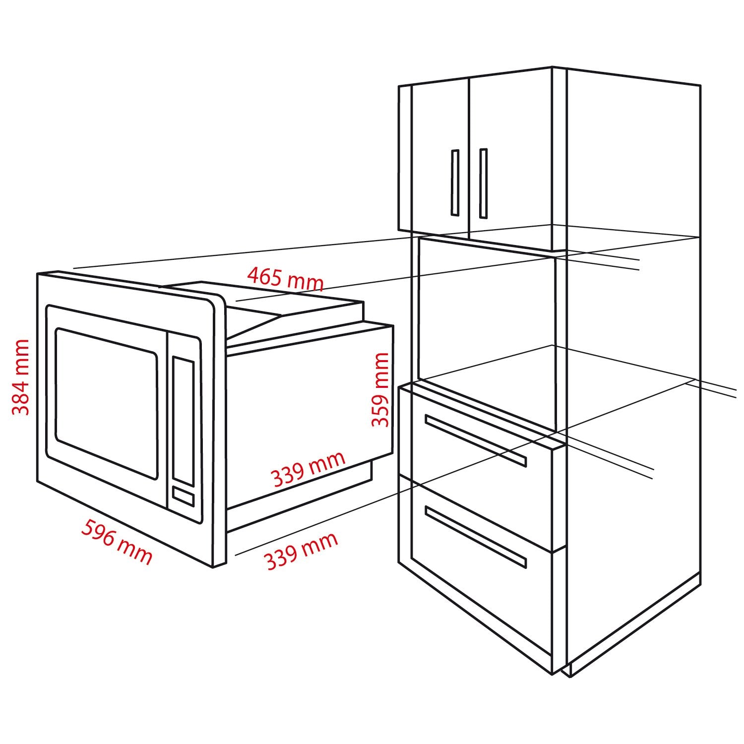 Dieses Gerät ist für den Einbau in einen standardmässigen 60 cm breiten Küchenschrank konzipiert. Die genauen Einbaumasse inklusive des passenden Rahmens betragen 596 mm in der Breite, 384 mm in der Höhe und 339 mm in der Tiefe.