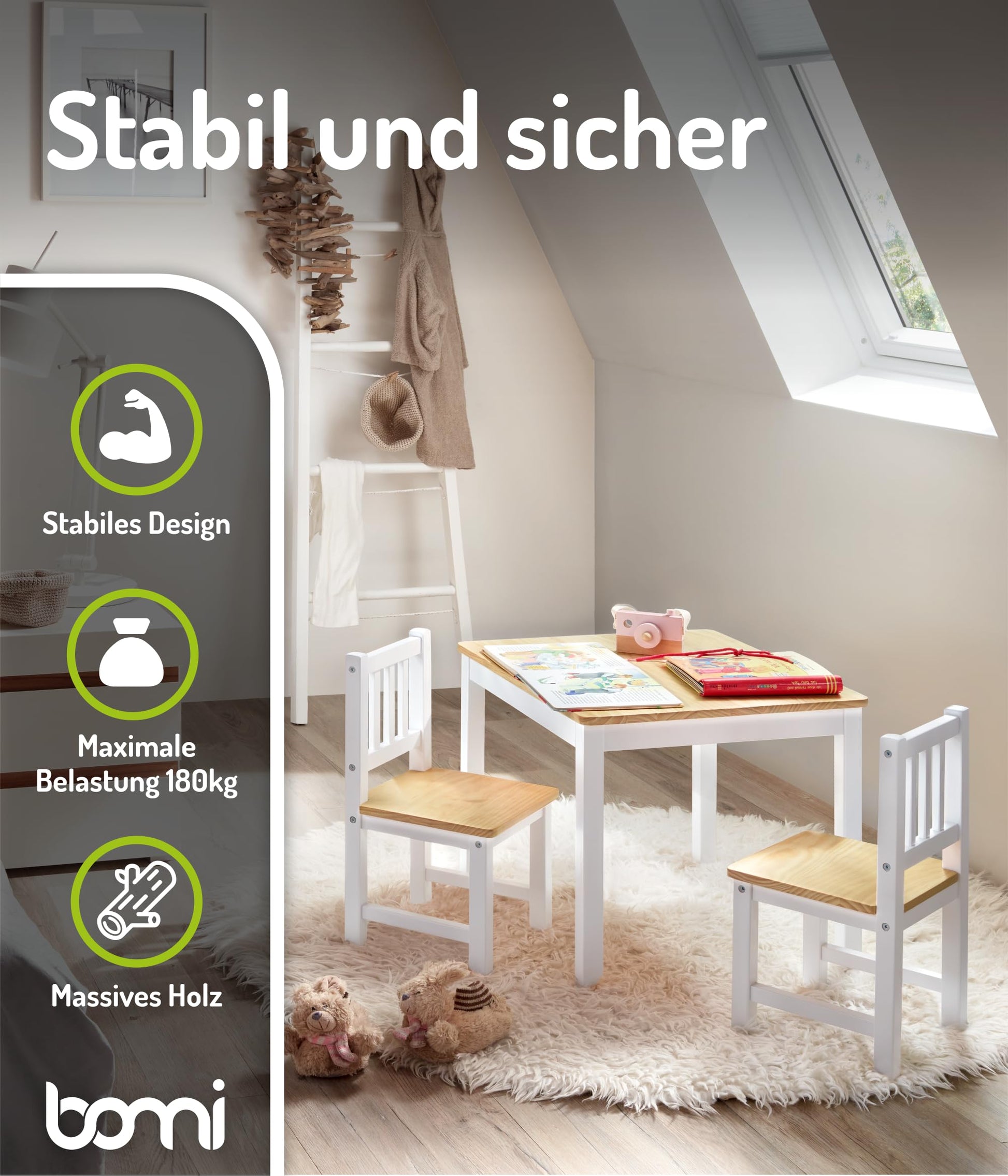 Bomi Amy Kindertisch mit 2 Stühlen Set Holz Weiss Natur