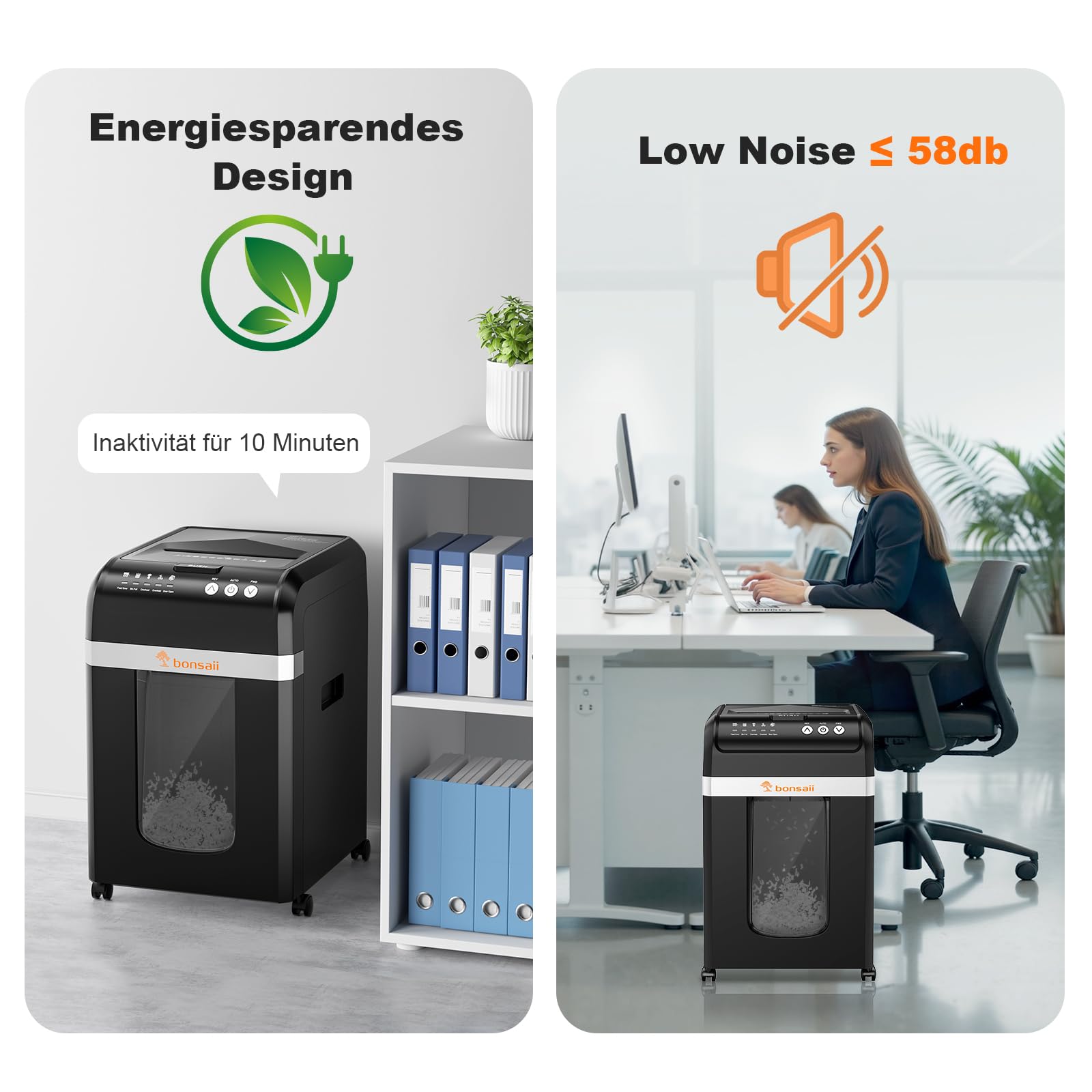 Der Aktenvernichter ist auf Langlebigkeit und Sicherheit ausgelegt. Der automatische Energiesparmodus senkt nach 10 Minuten Inaktivität den Stromverbrauch, während Schutzmechanismen gegen Überhitzung, Überlastung und eine offene Tür einen sicheren Betrieb garantieren.