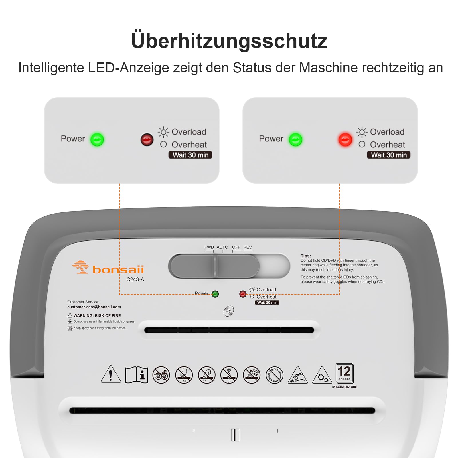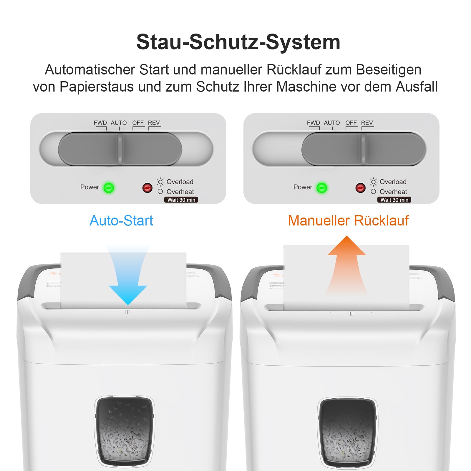 - Intelligente Schutzfunktionen: Ein integrierter Überhitzungs- und Überlastungsschutz stoppt den Motor automatisch bei zu langer Nutzung (über 6 Minuten) oder bei zu grosser Papierzufuhr. Nach einer Abkühlphase von 30 Minuten ist das Gerät wieder betriebsbereit.
