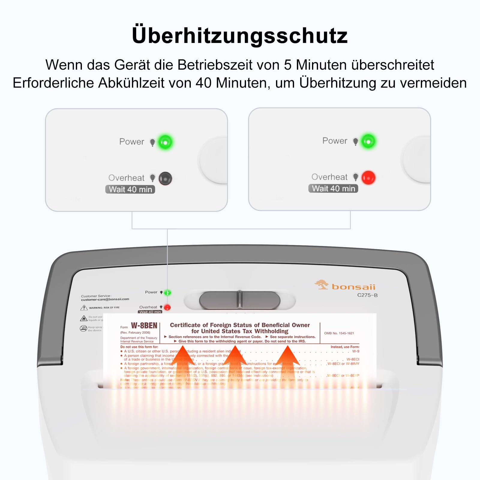 Sie können den Bonsaii C275-B für bis zu 5 Minuten ununterbrochen betreiben, ideal für die effiziente Erledigung grösserer Schredder-Aufgaben. Ein integrierter Überhitzungsschutz schaltet das Gerät danach automatisch ab, um den Motor zu schützen. Nach einer Abkühlzeit von 40 Minuten ist er wieder voll einsatzbereit.