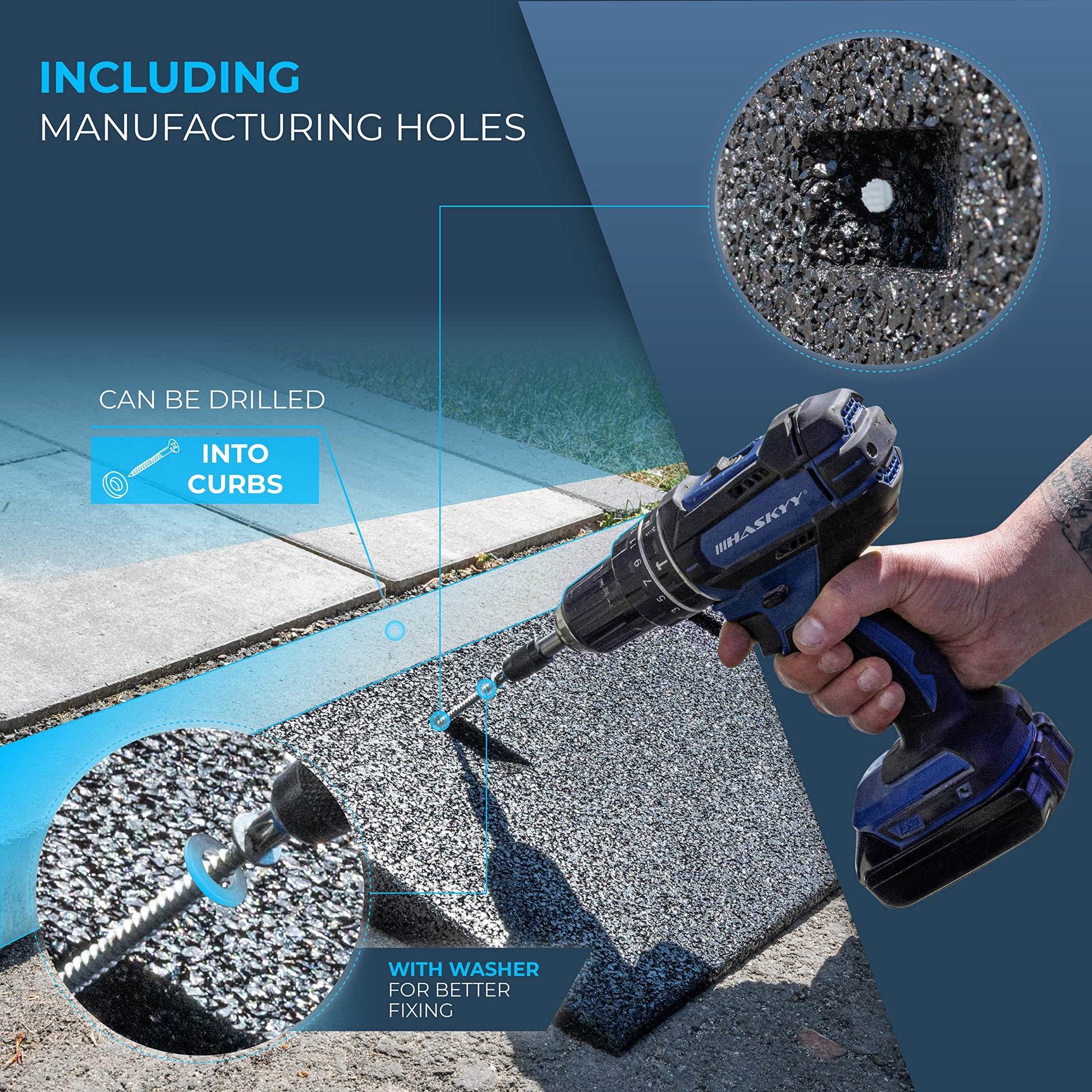 Dank des hohen Eigengewichts und des flexiblen Gummigranulats liegen die Rampen sehr stabil und passen sich leichten Unebenheiten oder gewölbten Kanten optimal an. Für maximale Sicherheit können sie zusätzlich fest montiert werden.