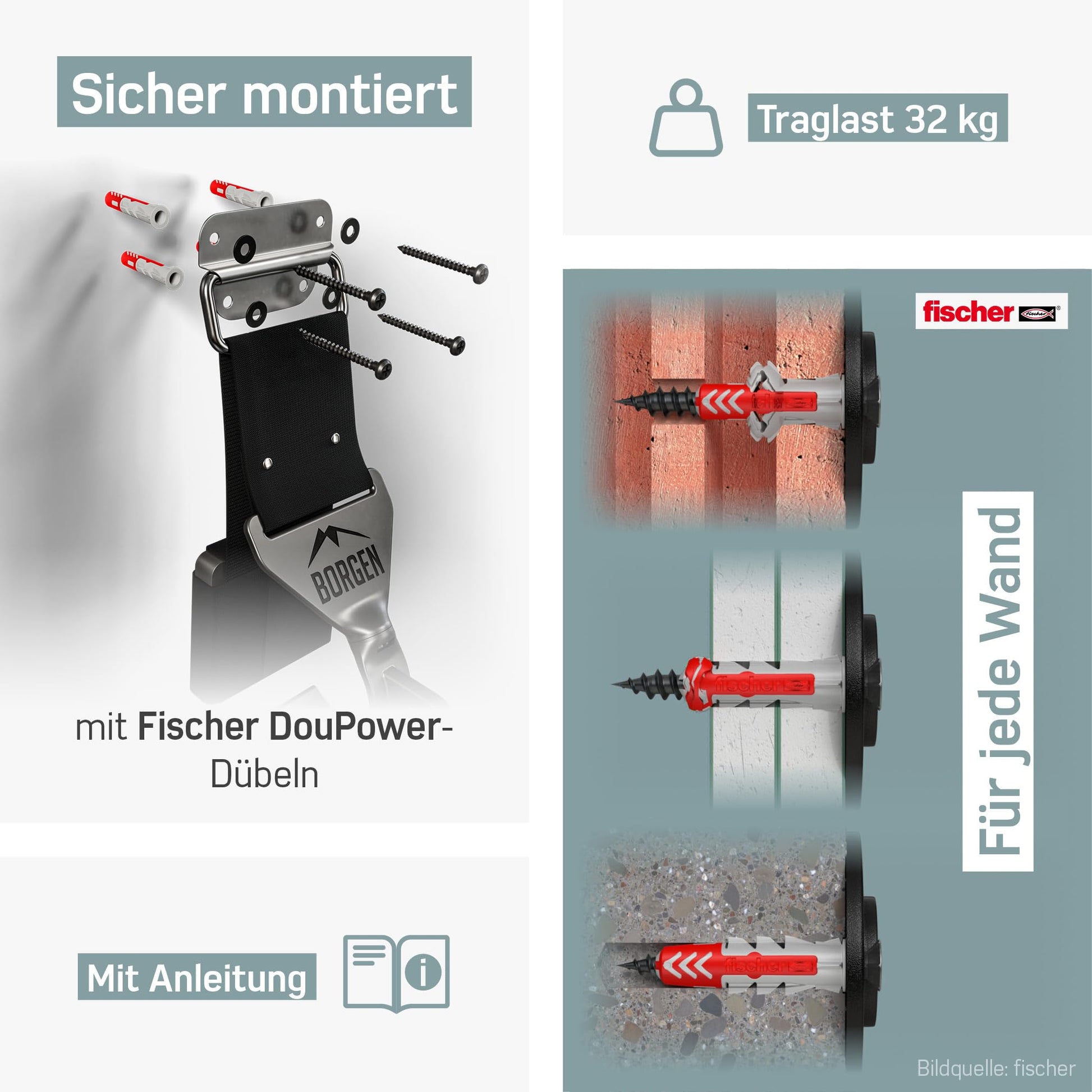 - Zuverlässige Befestigung: Im Lieferumfang sind hochwertige Fischer Duopower Dübel enthalten, die einen sicheren Halt in den verschiedensten Wandtypen gewährleisten.