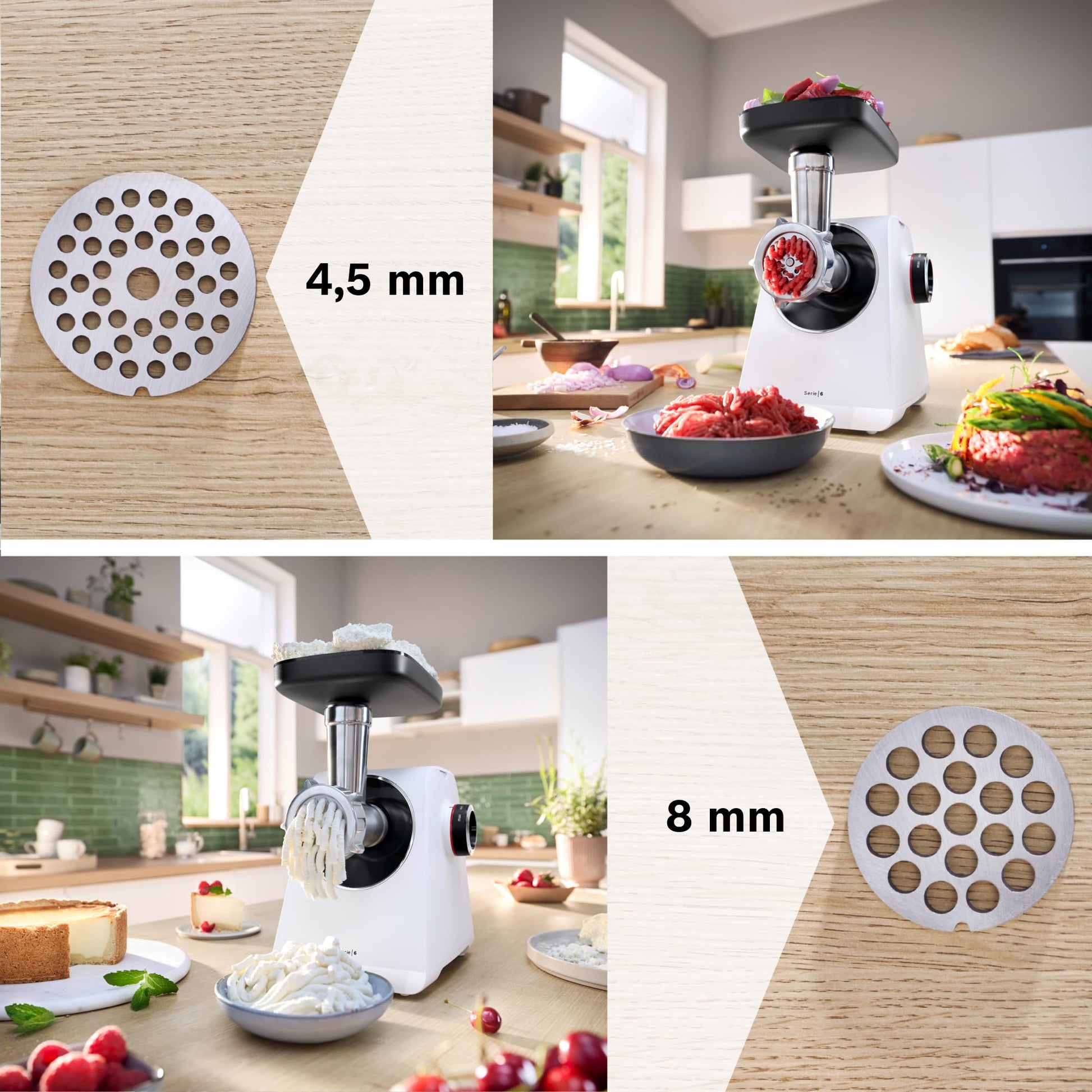 Kreative Vielfalt in Ihrer Küche: Ob saftige Burger-Patties, würzige Fleischbällchen, traditionelle Kebbe oder hausgemachte Würste – mit den mitgelieferten Aufsätzen und den zwei Lochscheiben (4,5 mm und 8 mm) sind Ihrer Fantasie keine Grenzen gesetzt. Verarbeiten Sie Fleisch, Fisch und Gemüse ganz nach Ihrem Geschmack.