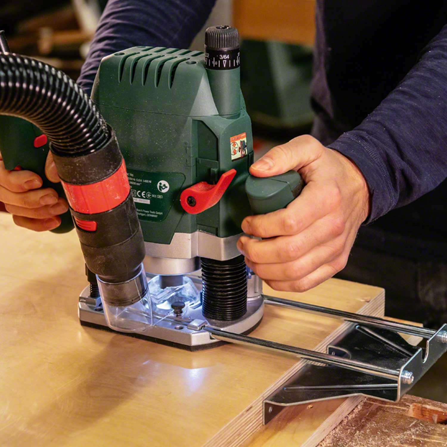 Die Oberfräse ermöglicht höchste Präzision. Die Frästiefe lässt sich auf 1/10 Millimeter genau justieren und arretieren. Zusammen mit der integrierten Arbeitsleuchte und dem Absauganschluss garantiert dies exakte, saubere und wiederholgenaue Ergebnisse.
