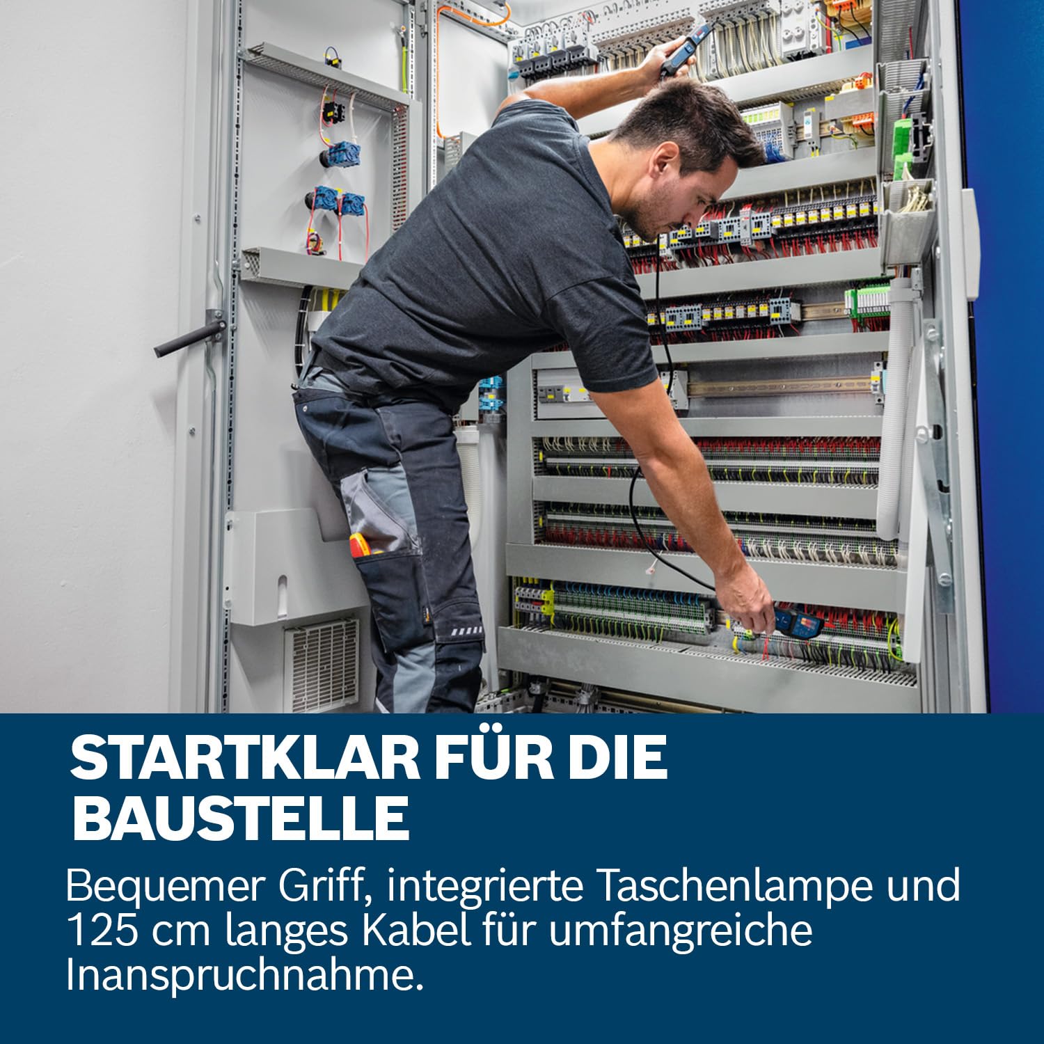 Der GVT 1000-15 von Bosch Professional ist ein zuverlässiger und robuster Spannungsprüfer, der für den anspruchsvollen Einsatz im professionellen Umfeld konzipiert wurde und höchste Sicherheitsstandards erfüllt.