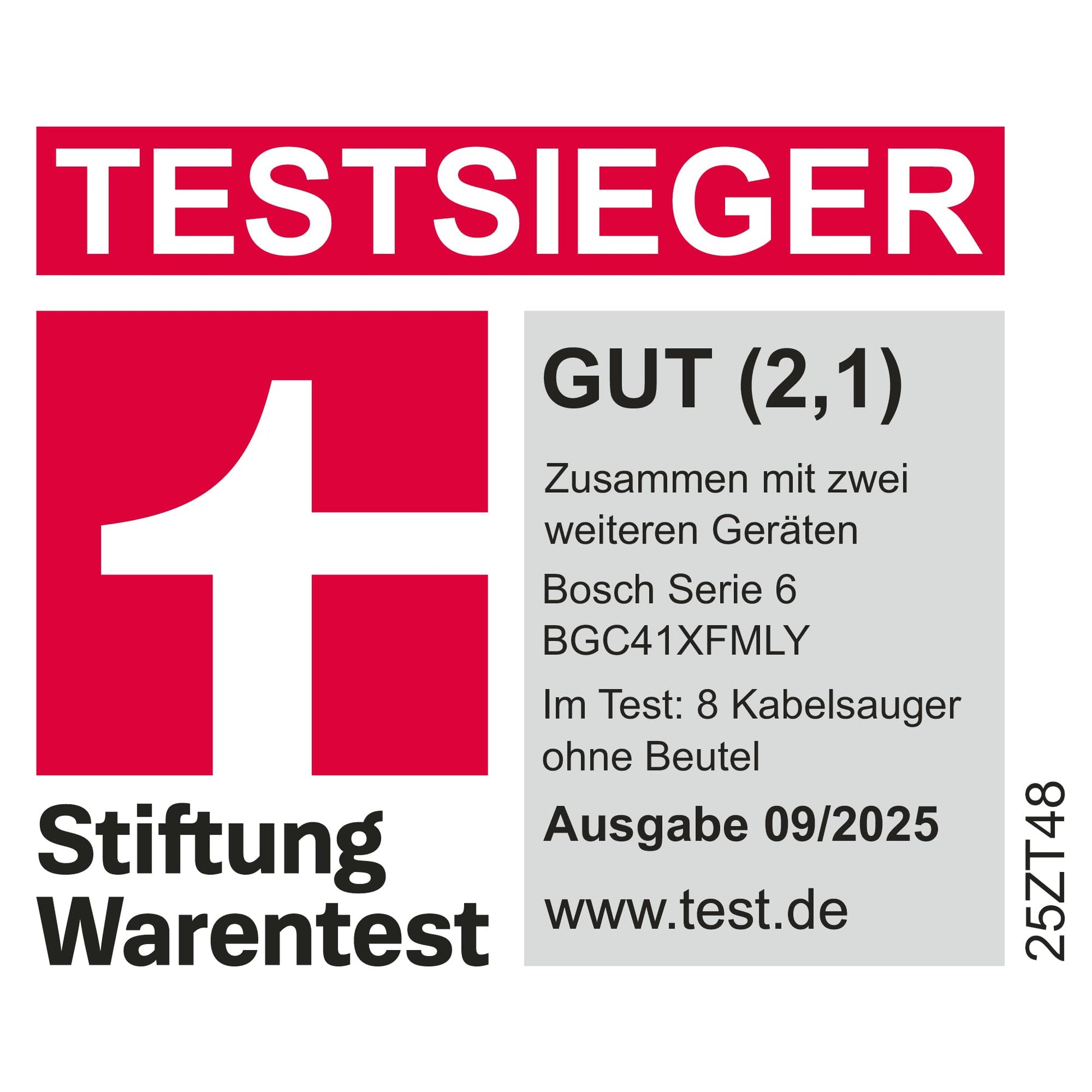 Der Staubsauger wurde von der Stiftung Warentest in der Ausgabe 09/2025 als Testsieger ausgezeichnet. Diese Bewertung bestätigt seine überzeugende und herausragende Reinigungsleistung auf allen getesteten Oberflächen, insbesondere auf Hartböden, Polstern und in Ecken.