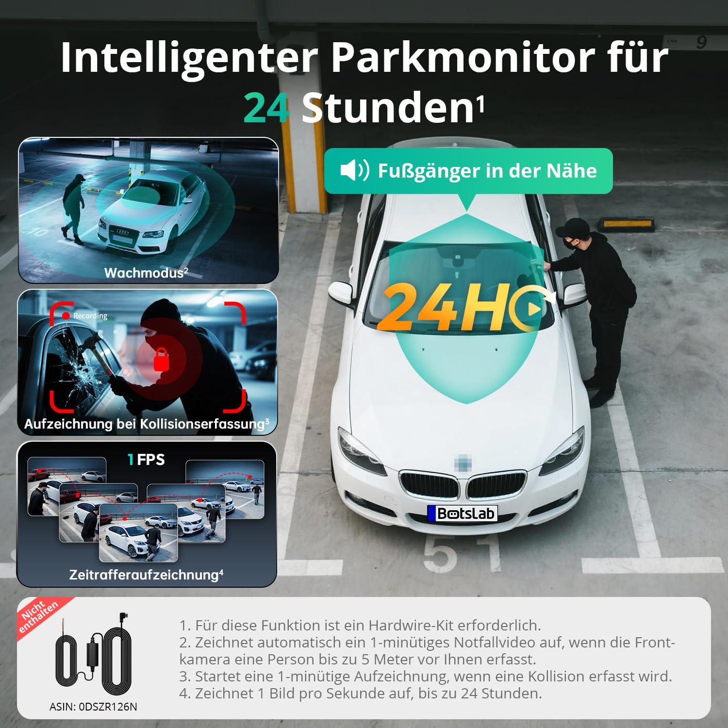 Ja, die Dashcam verfügt über eine intelligente Parküberwachung mit Zeitraffer- und Kollisionserkennungsmodi, die Ihr Fahrzeug vor Vandalismus oder Parkschäden schützt. Um diese Funktion zu nutzen und eine Entladung der Autobatterie zu verhindern, ist ein separates Hardwire-Kit (separat erhältlich) für die Stromversorgung erforderlich.