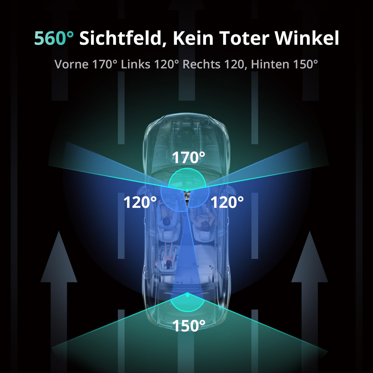 - Blickwinkel: 170° (vorne), 150° (hinten), 120° (links), 120° (rechts)