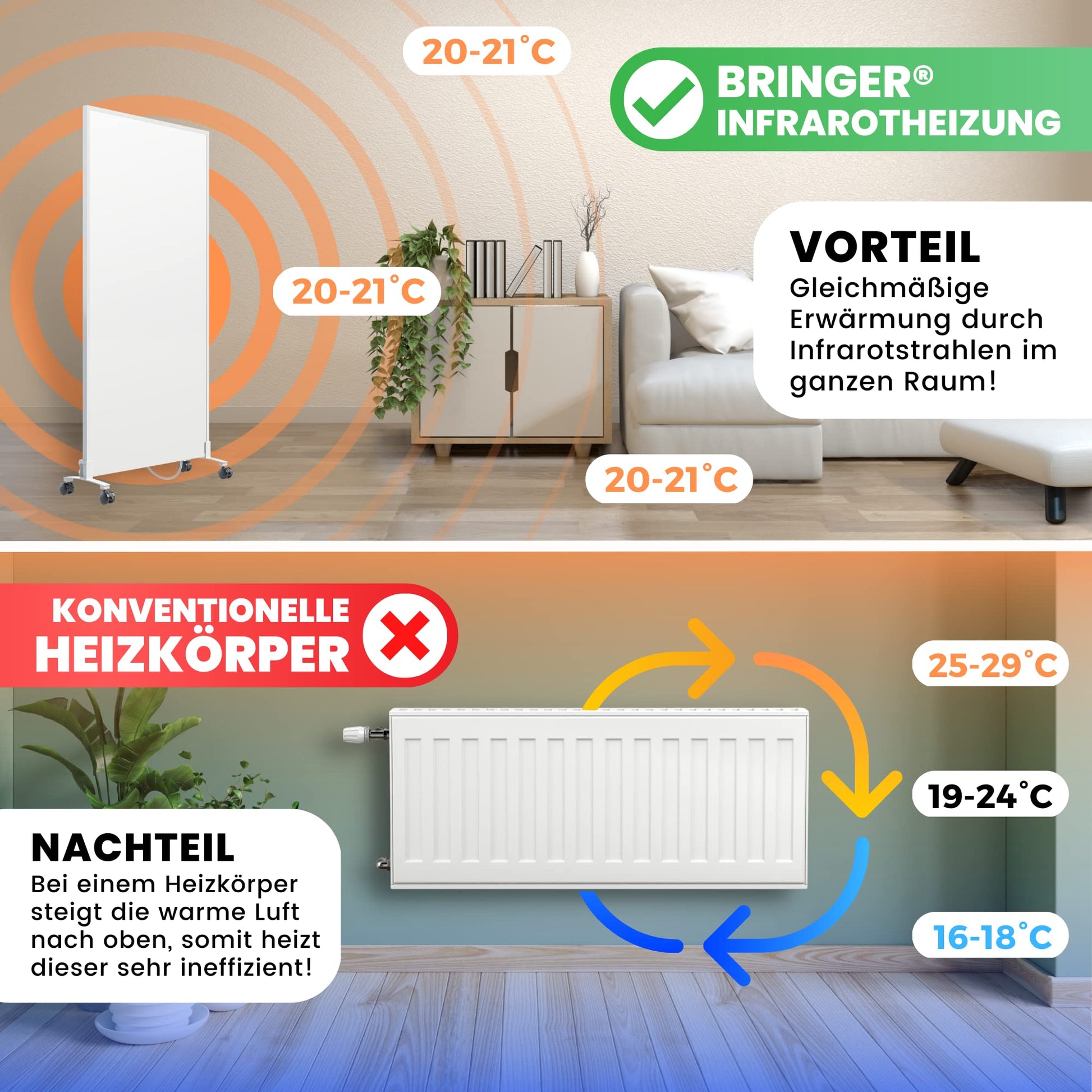- Inhalt: 1x Bringer Infrarotheizung 1200 W, 1 Paar Standfüsse mit Rollen, 5x Dübel & Schrauben, Bedienungs- & Montageanleitung
