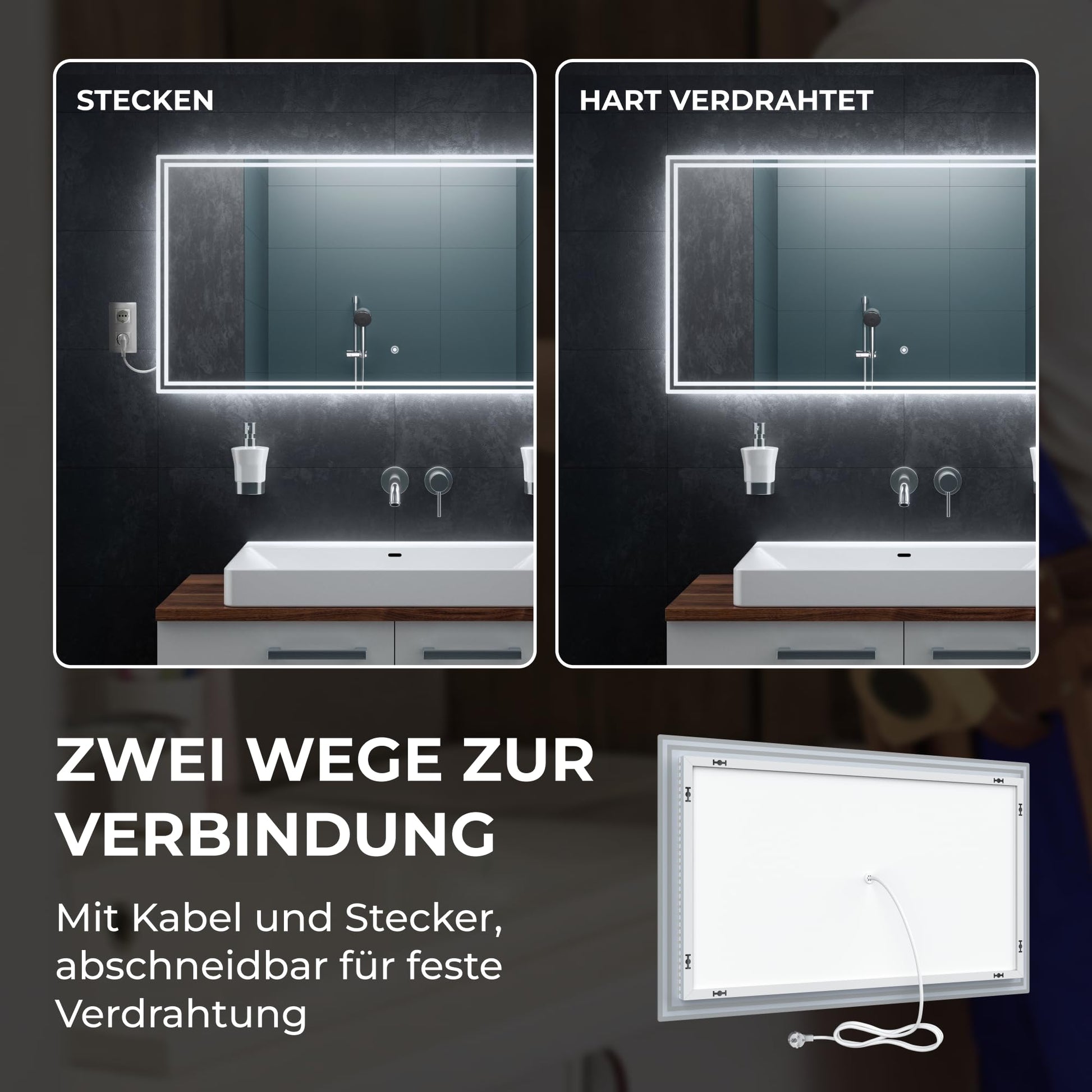 - Im Paket enthalten: 1x LED Badspiegel, komplettes Montagematerial (Dübel, Schrauben, Bohrschablone), Montage- und Betriebsanleitung