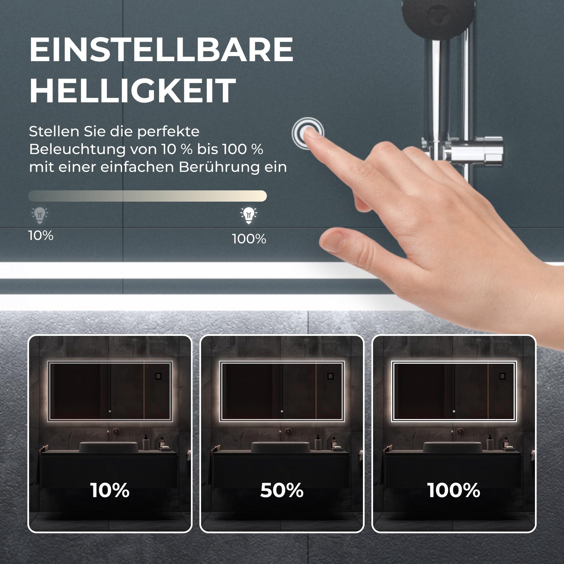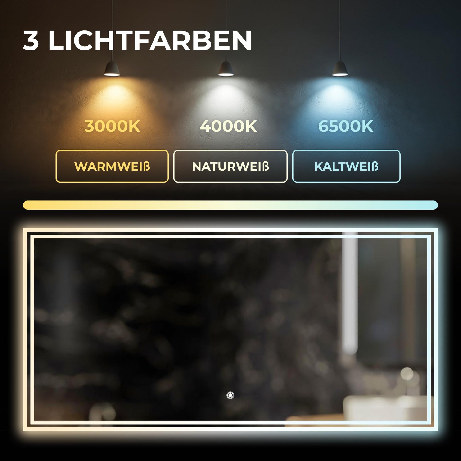 - Anpassbare Beleuchtung: Wählen Sie per Touch-Steuerung zwischen drei verschiedenen Lichtfarben (Kaltweiss, Neutralweiss, Warmweiss) und passen Sie die Helligkeit stufenlos an Ihre Bedürfnisse an.