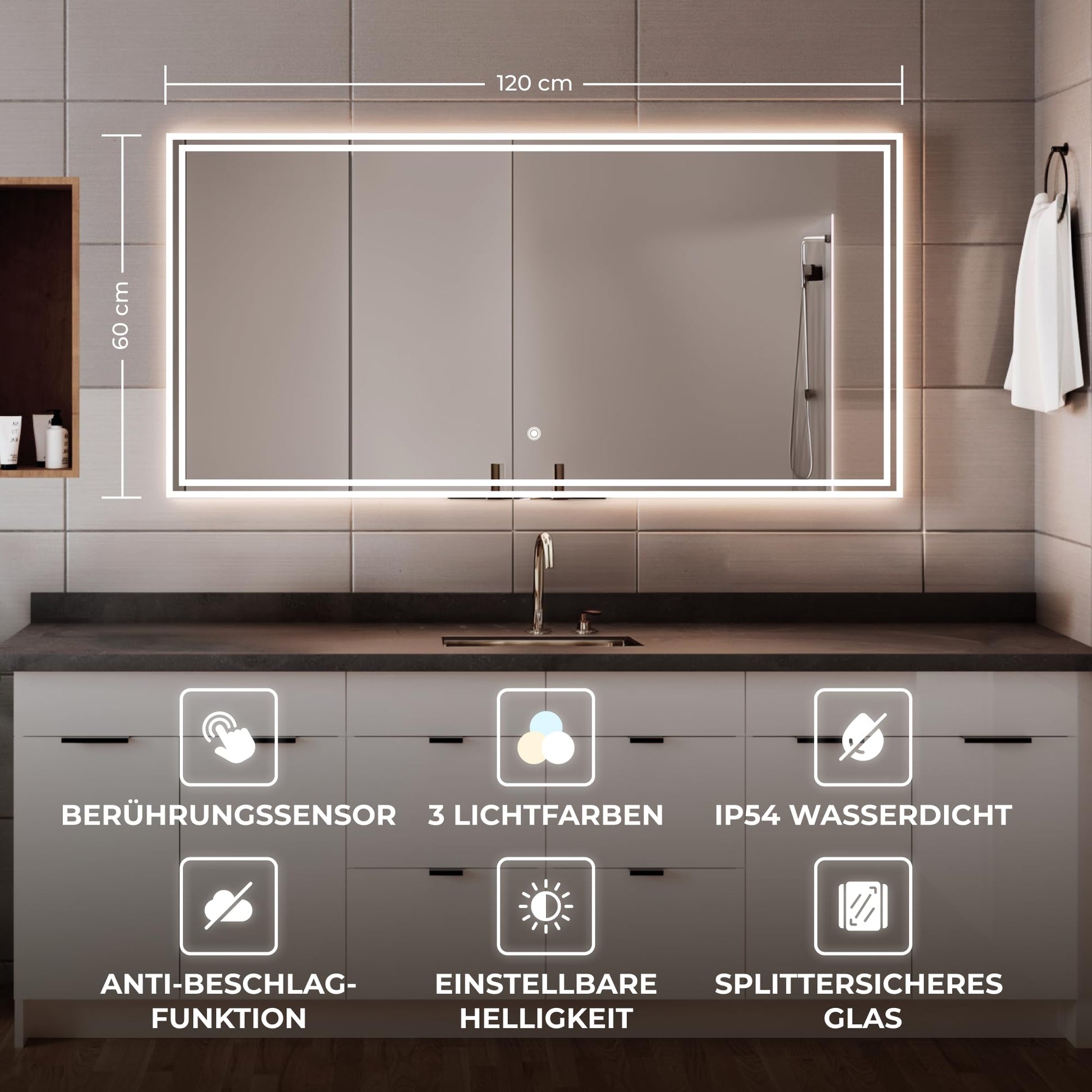Absolut. Der Spiegel ist nach Schutzklasse IP54 zertifiziert, was bedeutet, dass er gegen Staub und Spritzwasser geschützt ist. Zusätzlich sorgen eine versiegelte Rückseite und ein Splitterschutz für maximale Sicherheit im Badezimmer.