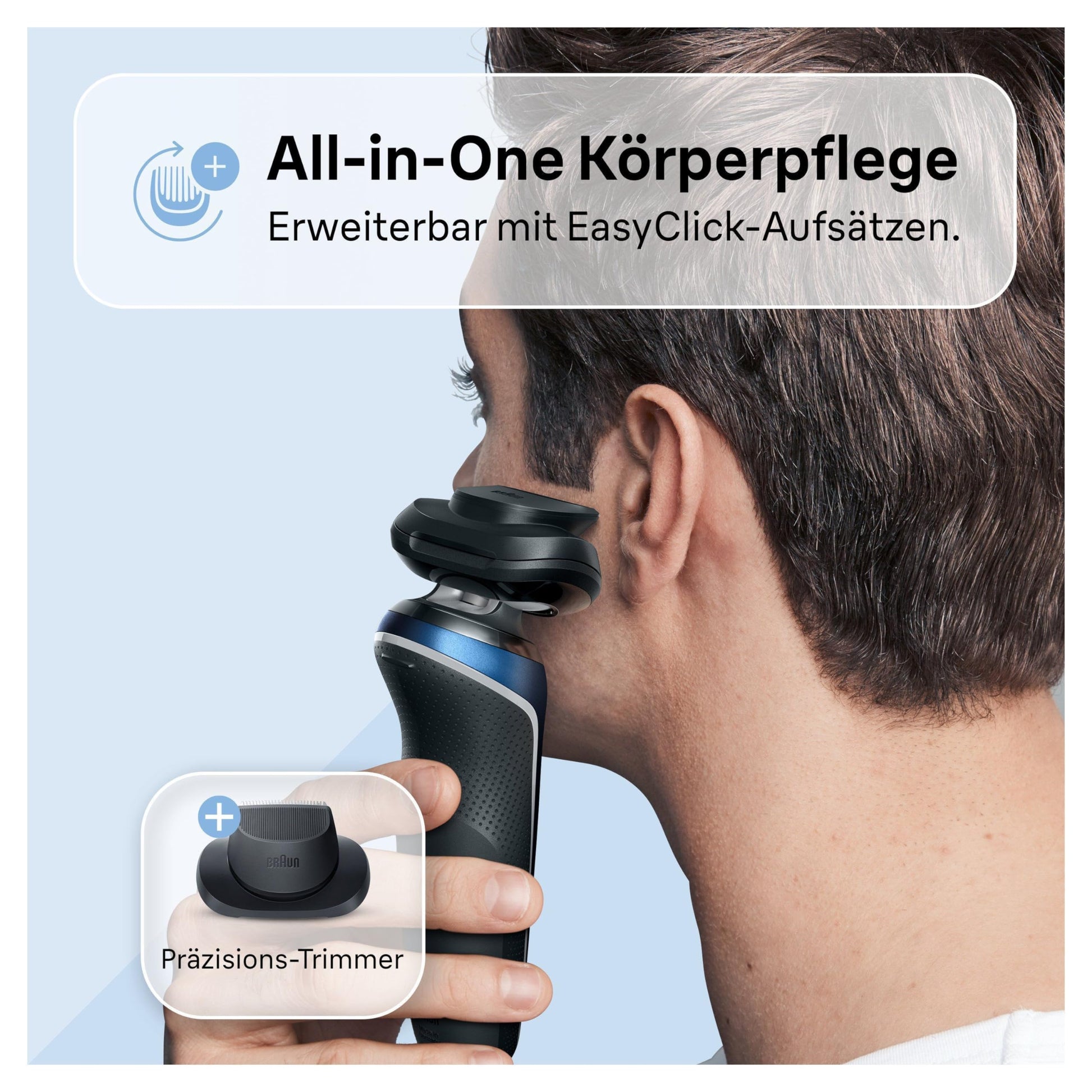 Geniessen Sie volle Flexibilität bei Ihrer Pflegeroutine. Ob eine schnelle Trockenrasur am Morgen oder eine ausgiebige Nassrasur unter der Dusche – dieser Rasierer ist für beides perfekt geeignet. Aus Sicherheitsgründen ist der Betrieb im nassen Zustand nur kabellos möglich. Das Gerät ist zudem mit dem EasyClick-System von Braun kompatibel, wodurch Sie es mit weiteren Aufsätzen für verschiedene Pflegebedürfnisse erweitern können.
