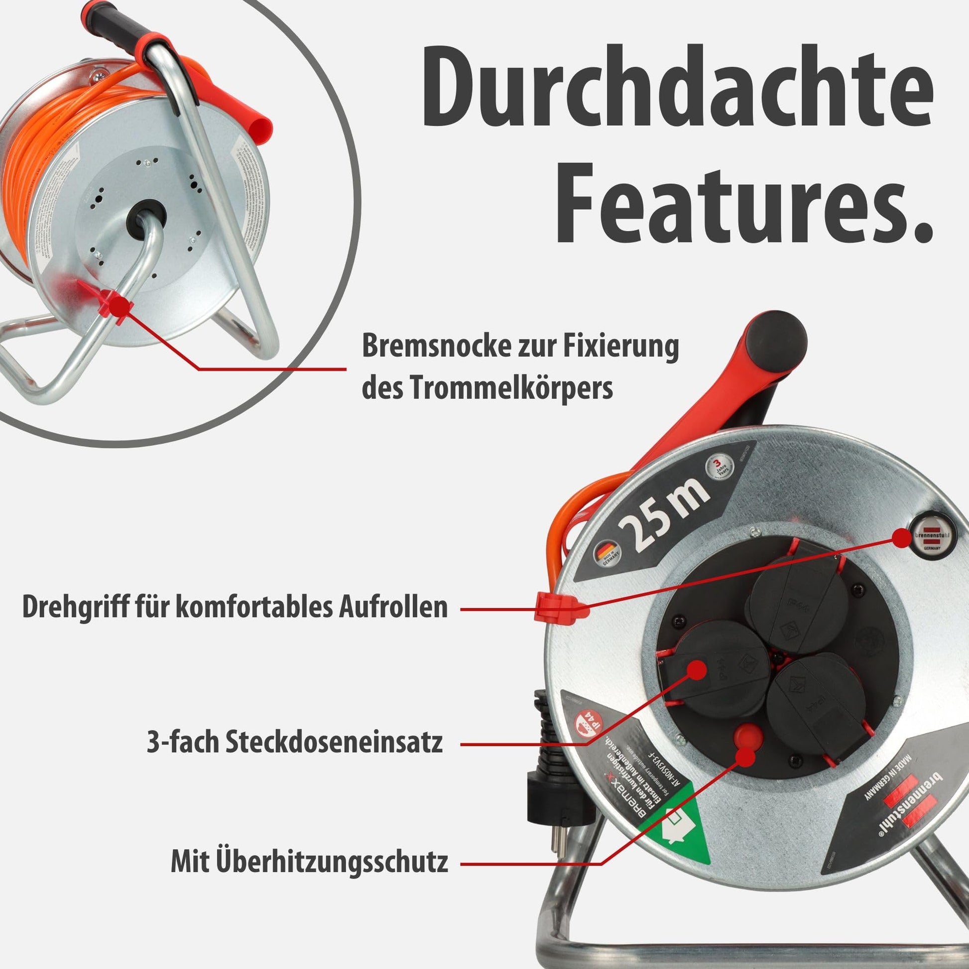 Für maximale Sicherheit verfügt die Trommel über einen Überhitzungsschutz mit Kontrollleuchte, der bei Überlastung die Stromzufuhr unterbricht. Zudem schützen drei spritzwassergeschützte Steckdosen mit selbstschliessenden Deckeln Ihre Geräte. Die maximale Belastbarkeit beträgt im aufgerollten Zustand ca. 1000 Watt und im voll abgerollten Zustand bis zu 3500 Watt.
