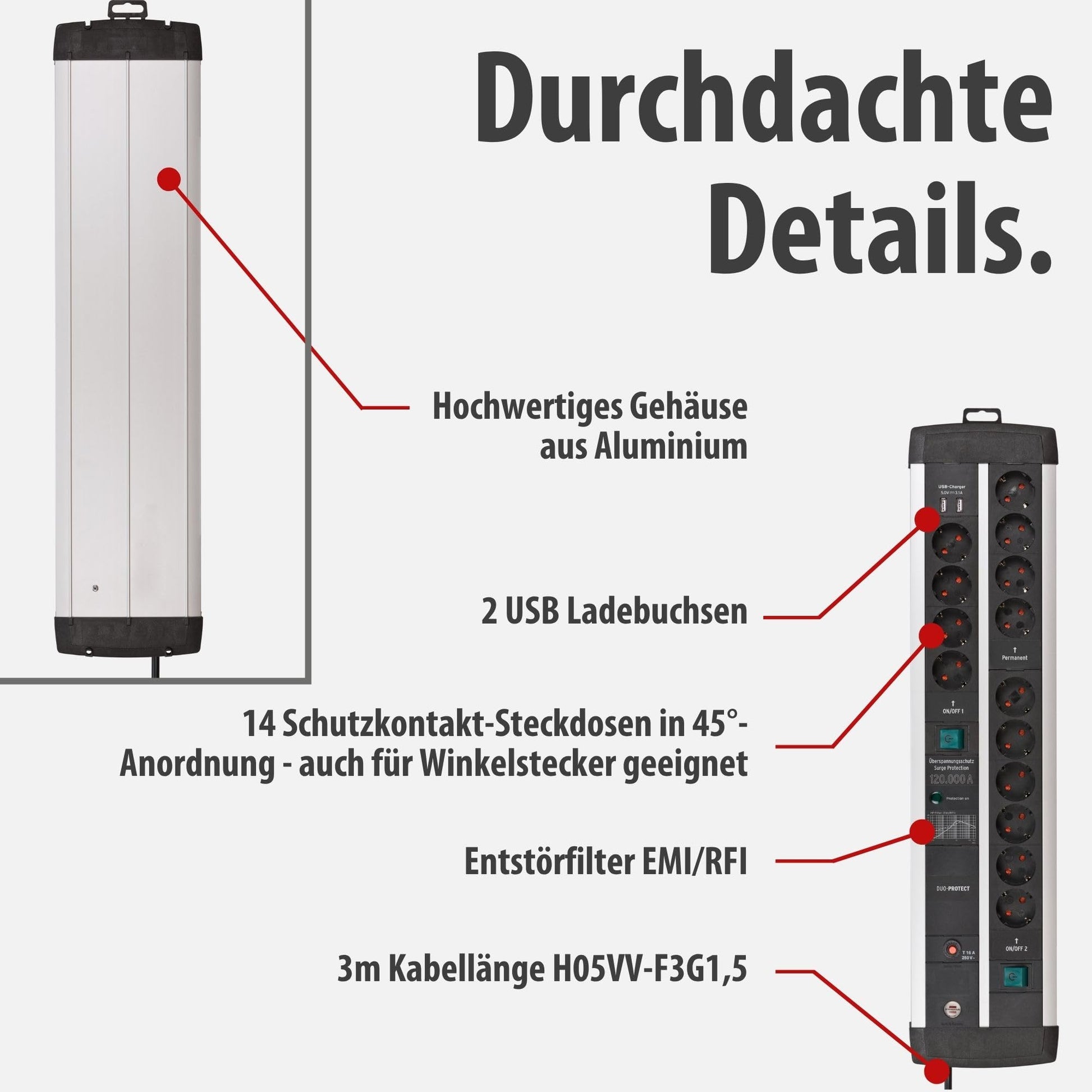 - 14 Schutzkontakt-Steckdosen für maximale Anschlussmöglichkeiten
