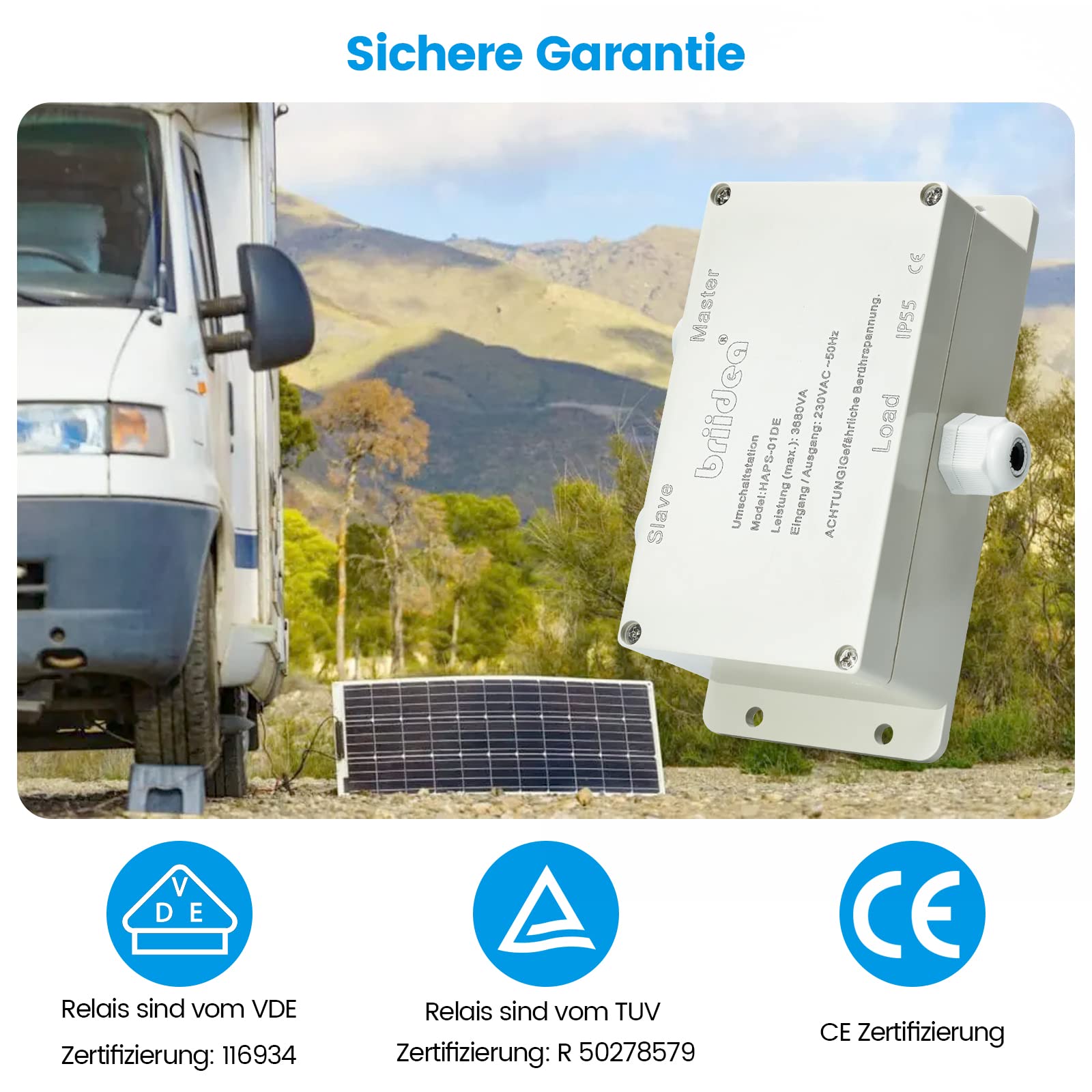 Um Ihren Wechselrichter und Ihre angeschlossenen Geräte zu schützen. Wenn Sie externen Landstrom anschliessen, trennt diese Umschaltstation den Wechselrichter automatisch vom Bordnetz. Das verhindert, dass Rückstrom Ihre empfindliche Elektronik beschädigt und erspart Ihnen das manuelle Umschalten.