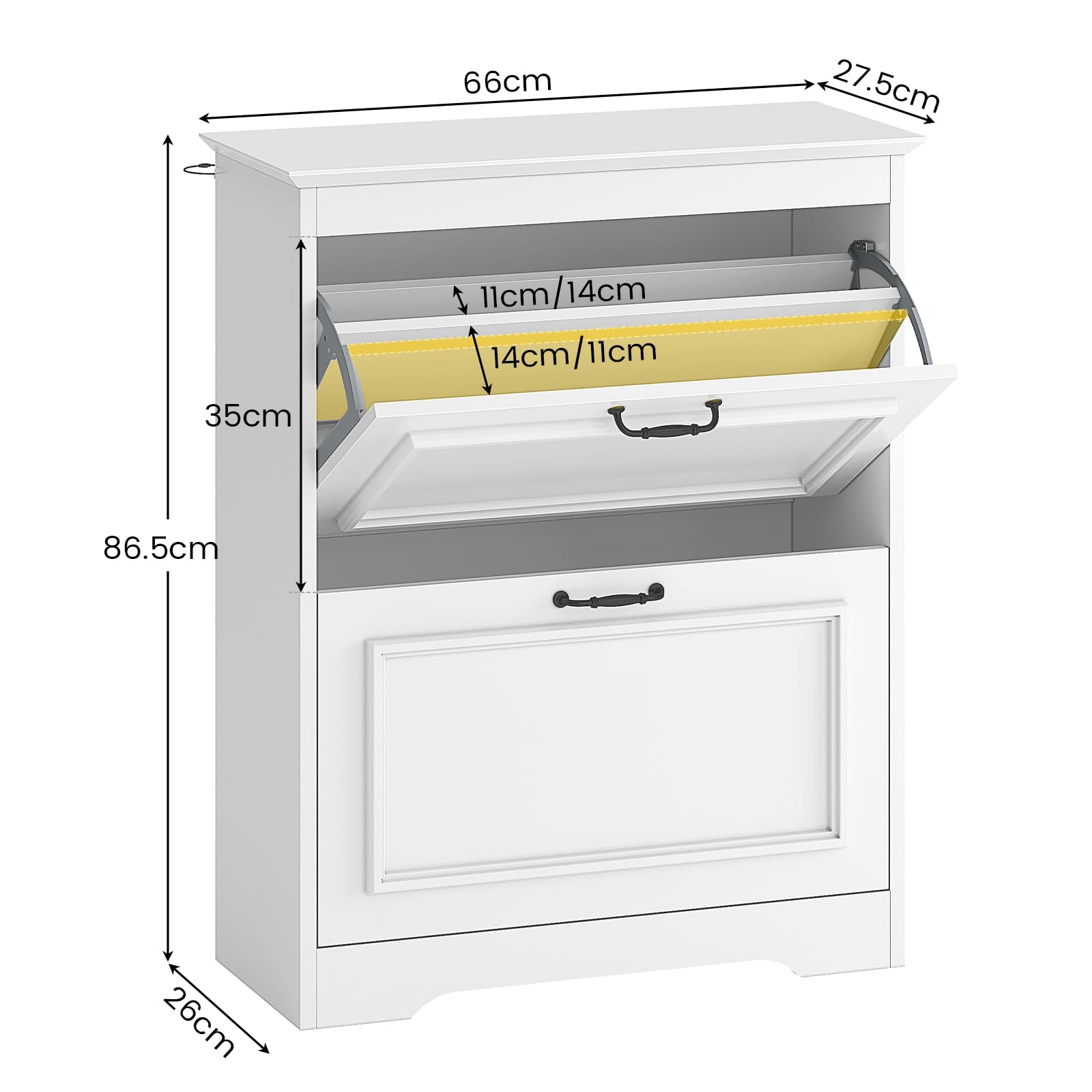 Dieser elegante Schuhkipper bietet eine stilvolle und äusserst platzsparende Lösung, um Ordnung in Ihrem Eingangsbereich zu schaffen. Mit seinem schlichten Design in Weiss fügt er sich nahtlos in jeden Flur, Korridor oder jedes Wohnzimmer ein.