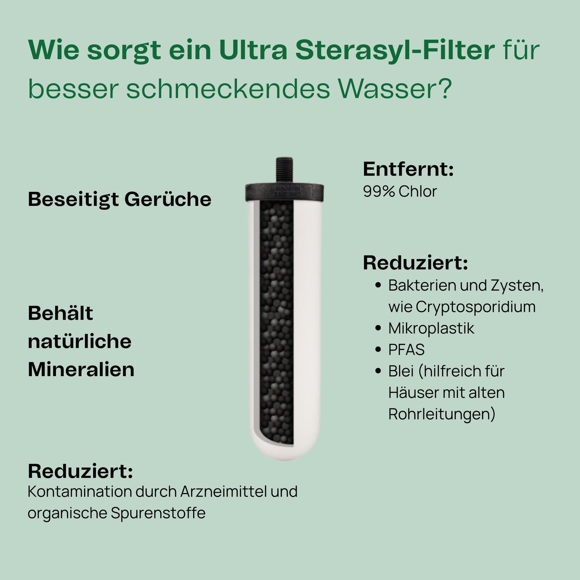 Der Ultra Sterasyl ist der direkte, verbesserte Nachfolger des ATC Super Sterasyl. Er bietet eine erweiterte Filterleistung, insbesondere bei der Reduzierung neuerer Kontaminanten wie PFAS, Pharmazeutika und Mikroplastik, was durch Tests nach der modernen Norm NSF/ANSI 401 bestätigt wird.